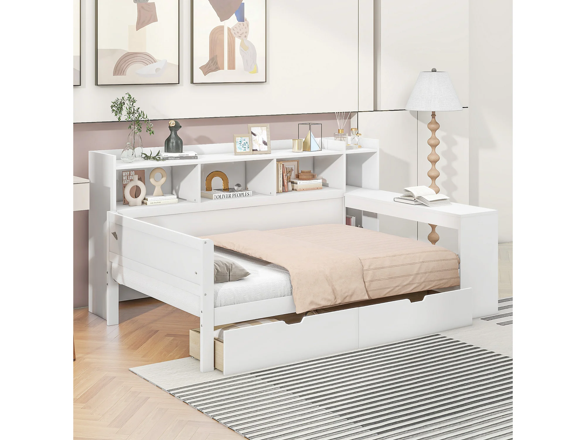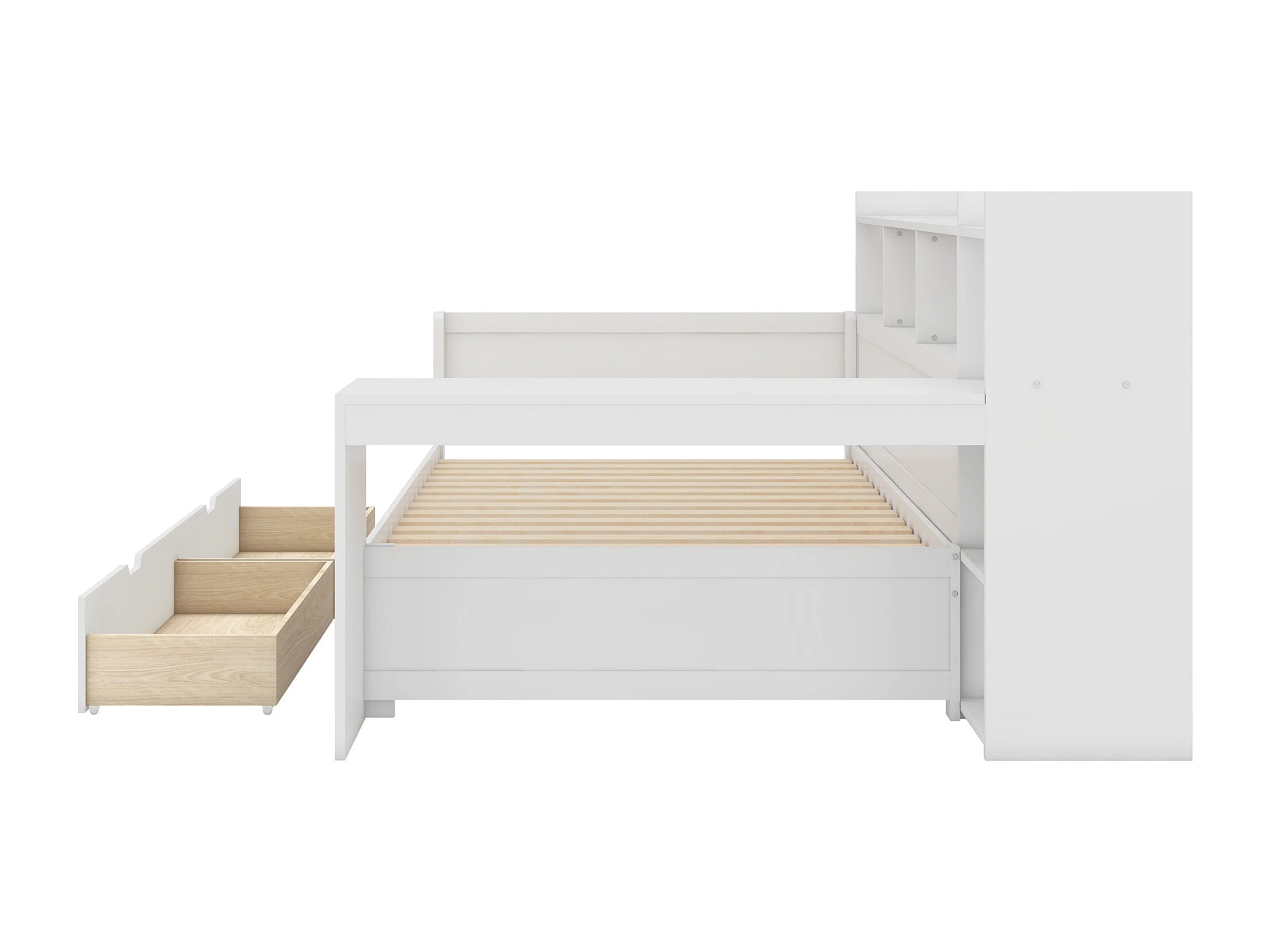 Dagbed 90 x 200 cm met stopcontact, USB-aansluiting, 2 lades en bureau - Matras niet inbegrepen - Wit PB-hout
