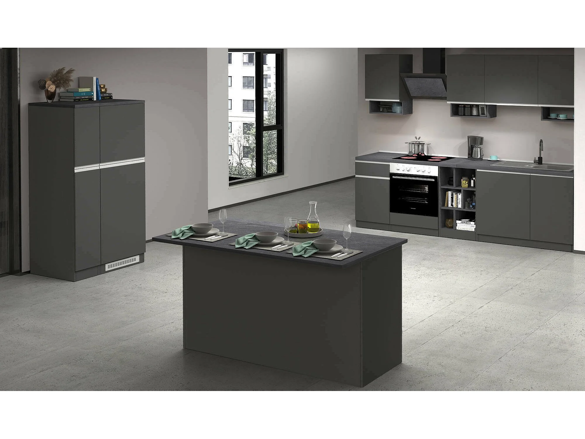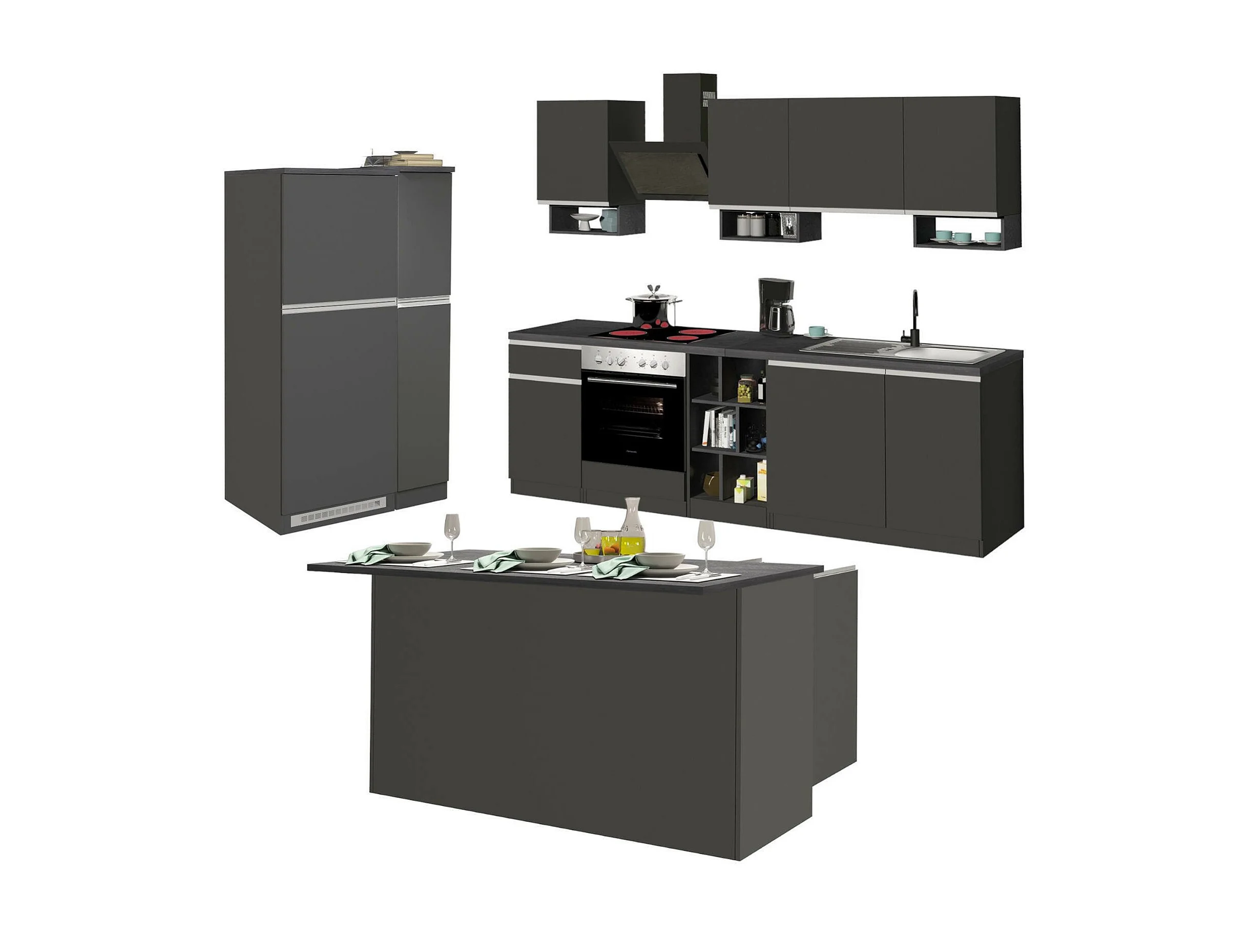 Dancelott complete keuken, Set met bijkeuken, Keukenkast, Blokkit met eiland en koelkasthouder, 100% Made in Italy, Antraciet en Leisteen