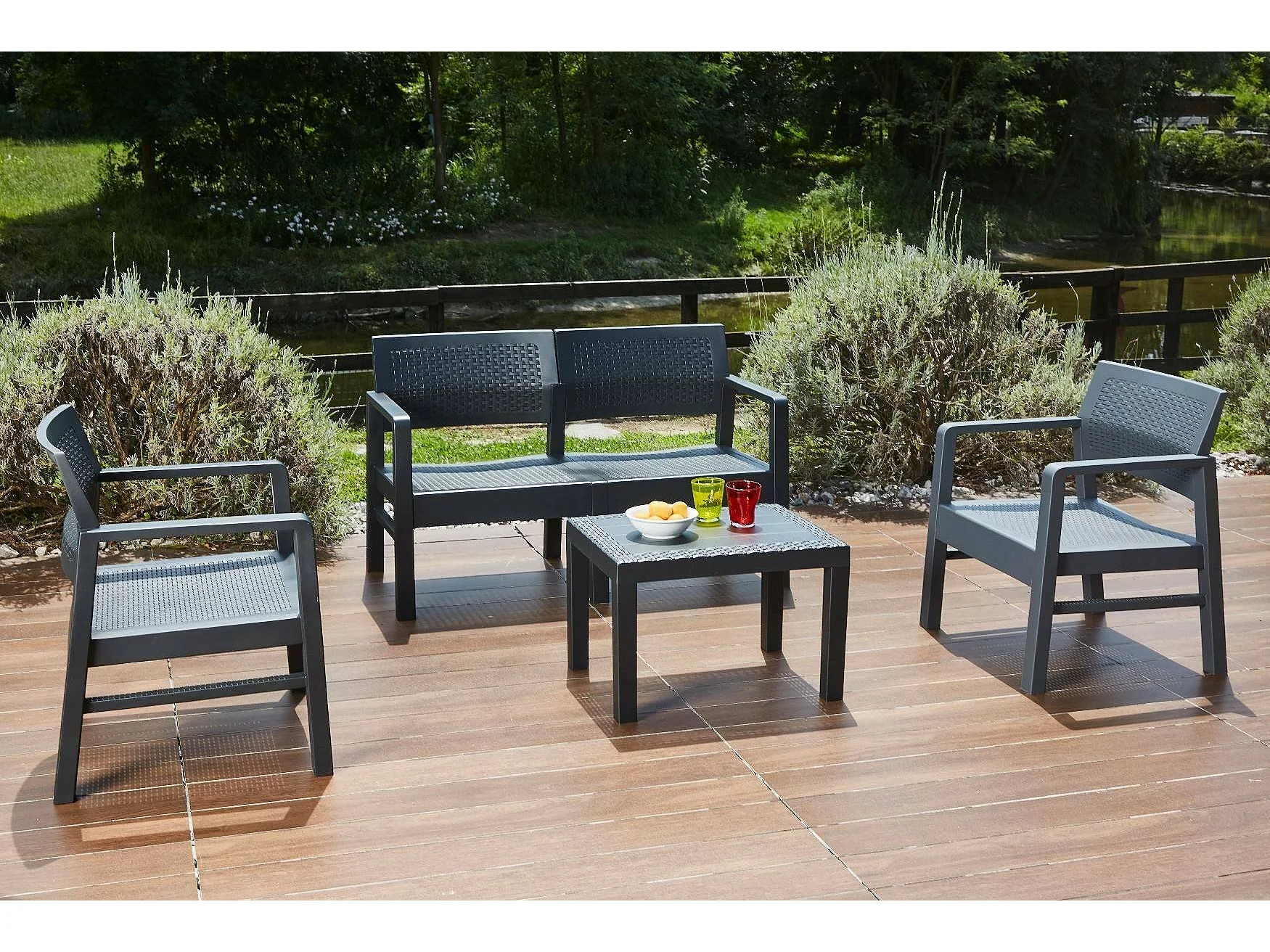 Dauter buitenloungeset, Tuinset met 2 fauteuils, 1 bank en 1 salontafel, Rotan effect lounge met kussens, 100% Made in Italy, Antraciet