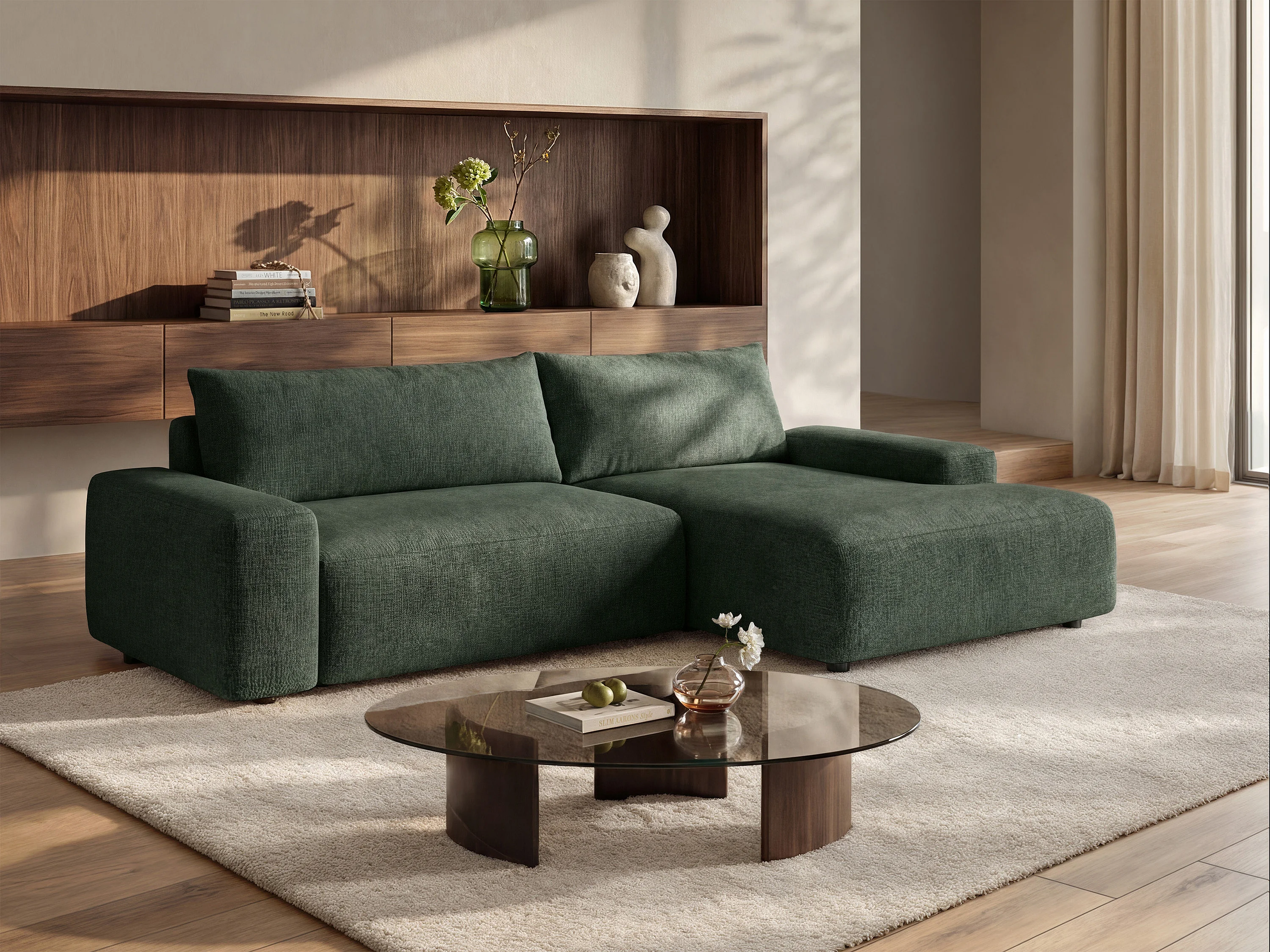 Hoekslaapbank met hoek rechts van groene stof met textuur DAVISO