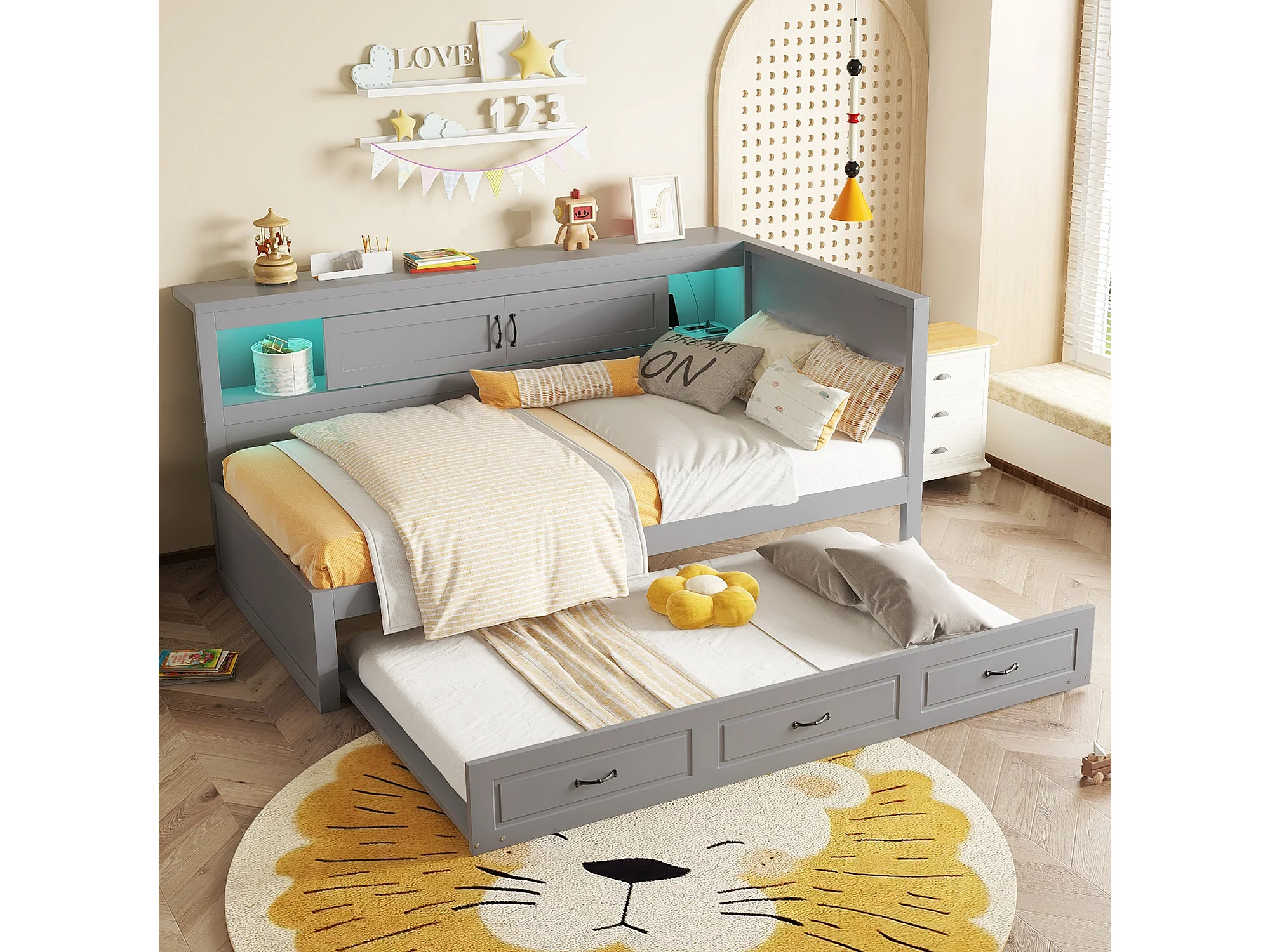 Daybed 90 x 200 cm met uitschuifbaar bed 90 x 190 cm - Met LED, USB en opbergruimte - Grijs