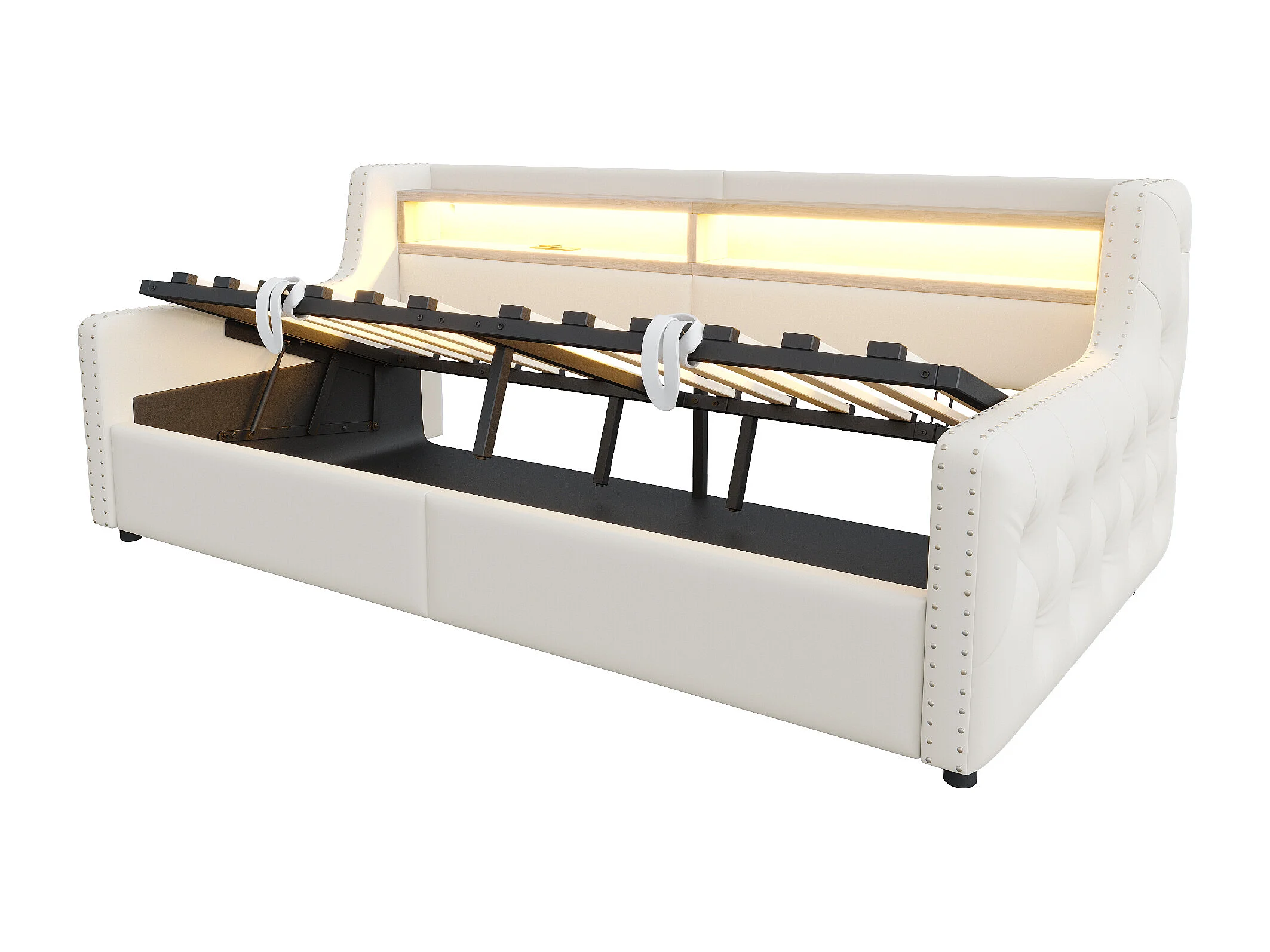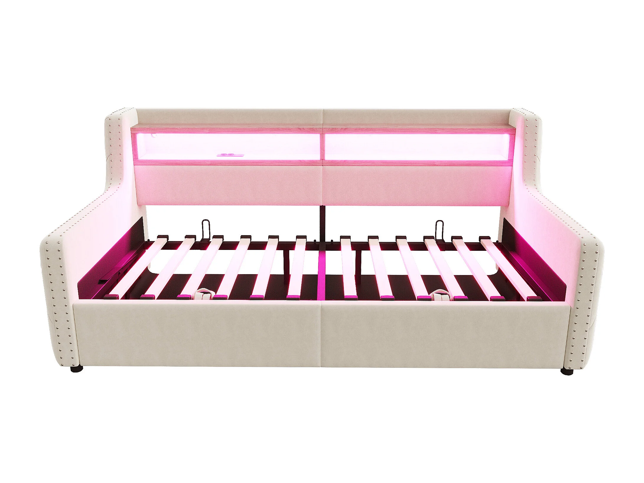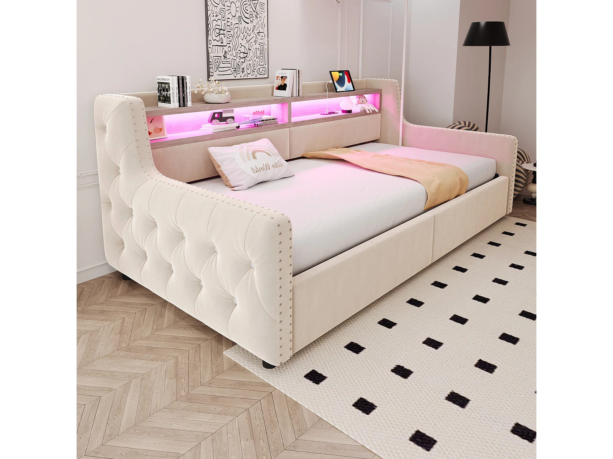 Daybed 90x200 cm, volwassen bed met opbergruimte, ledverlichting en USB-aansluitingen - beige fluweel (zonder matras)