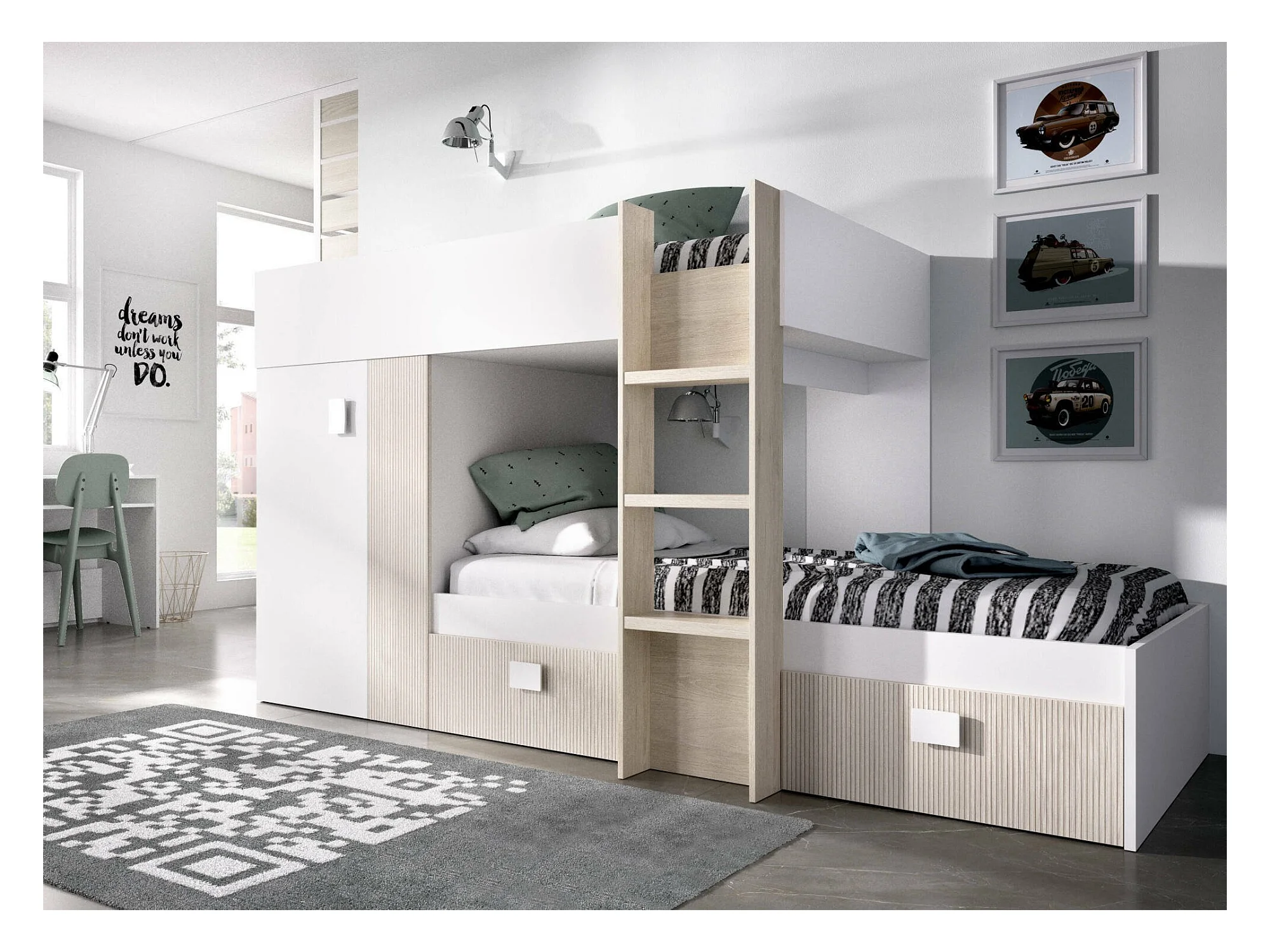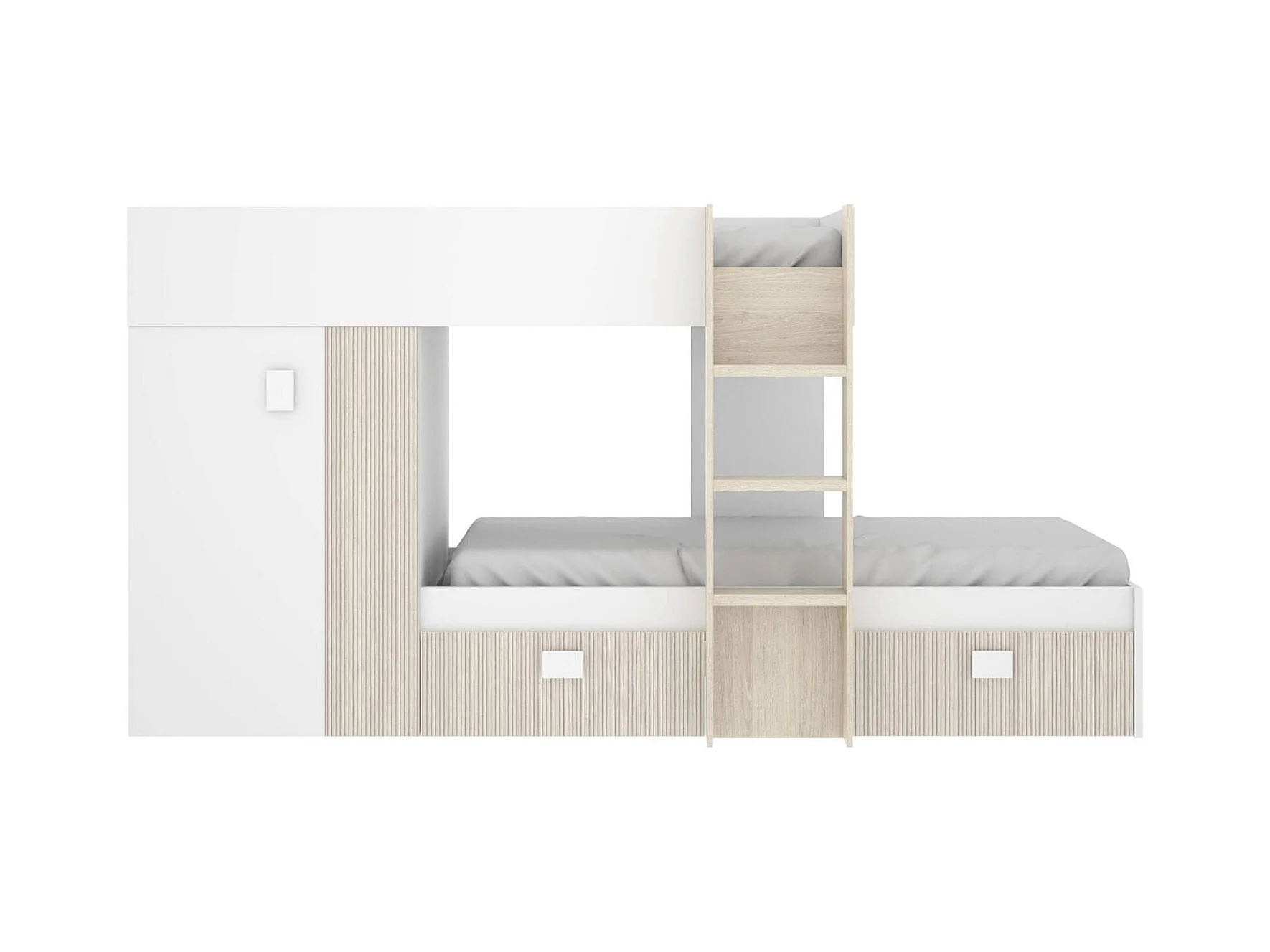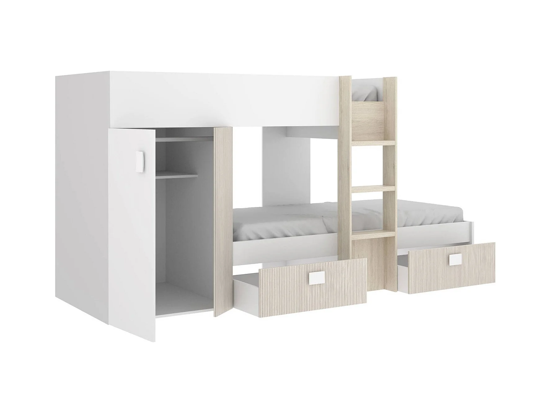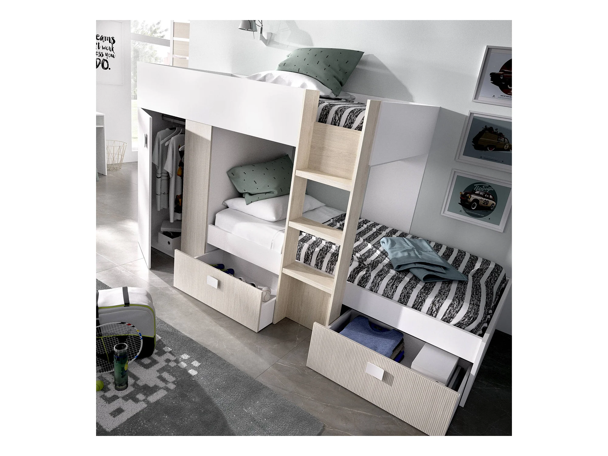 Dguerci kinderbed, Complete slaapkamer met kledingkast en laden, Stapelbedsamenstelling met twee eenpersoonsbedden, 255x112h150 cm, Wit en Eiken
