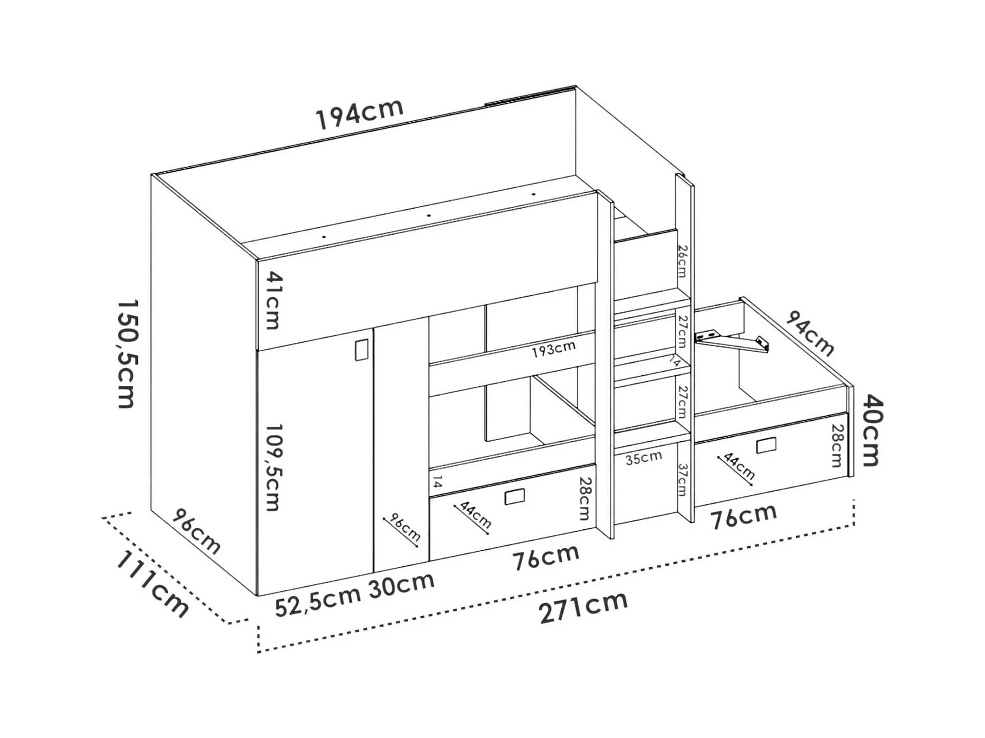 Dmatsuyam slaapkamersamenstelling, Complete slaapkamer, Kinderkamer, Brugmeubelset, 246x112 h150 cm, Wit en Eiken