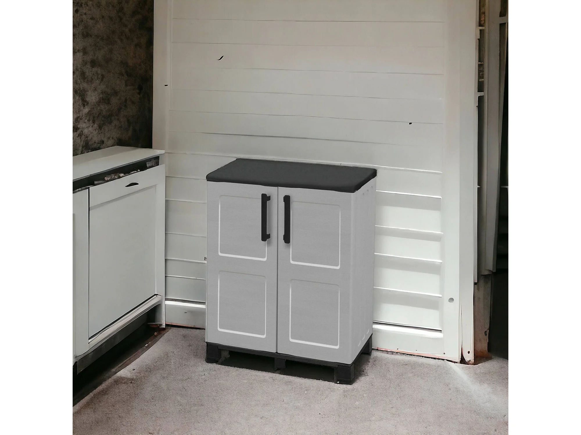 Dbirindell buitengarderobe, multifunctionele balkongarderobe, 2-deurs buitenkast, 100% gemaakt erinAly, 68x37h90 cm, Lichtgrijs & Zwart, Geruite afwerking