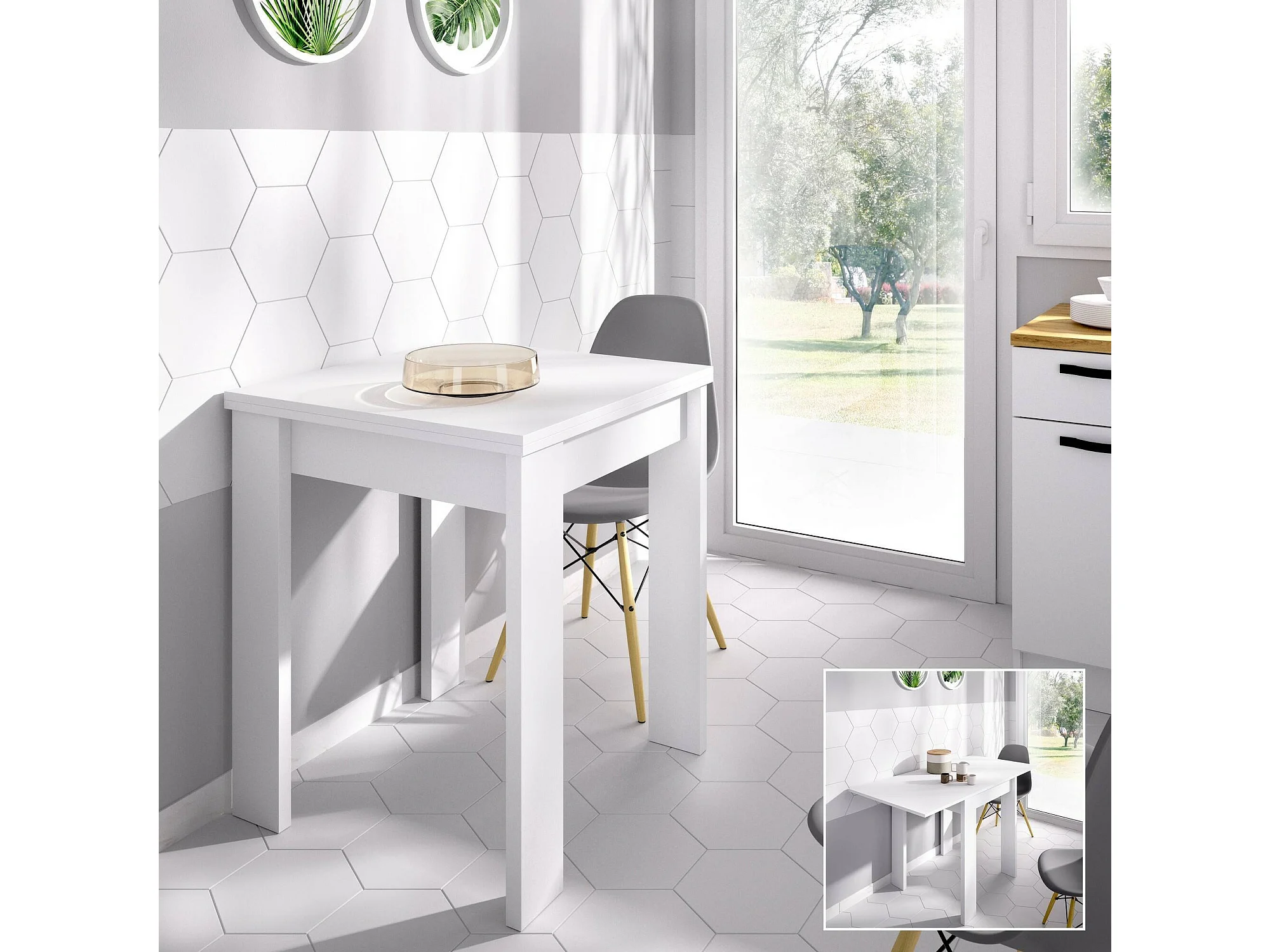 Dbli uitschuifbare tafel, Uitschuifbare console in meerdere posities, Inklapbare extra consoletafel, 79/134x67h79 cm, Wit