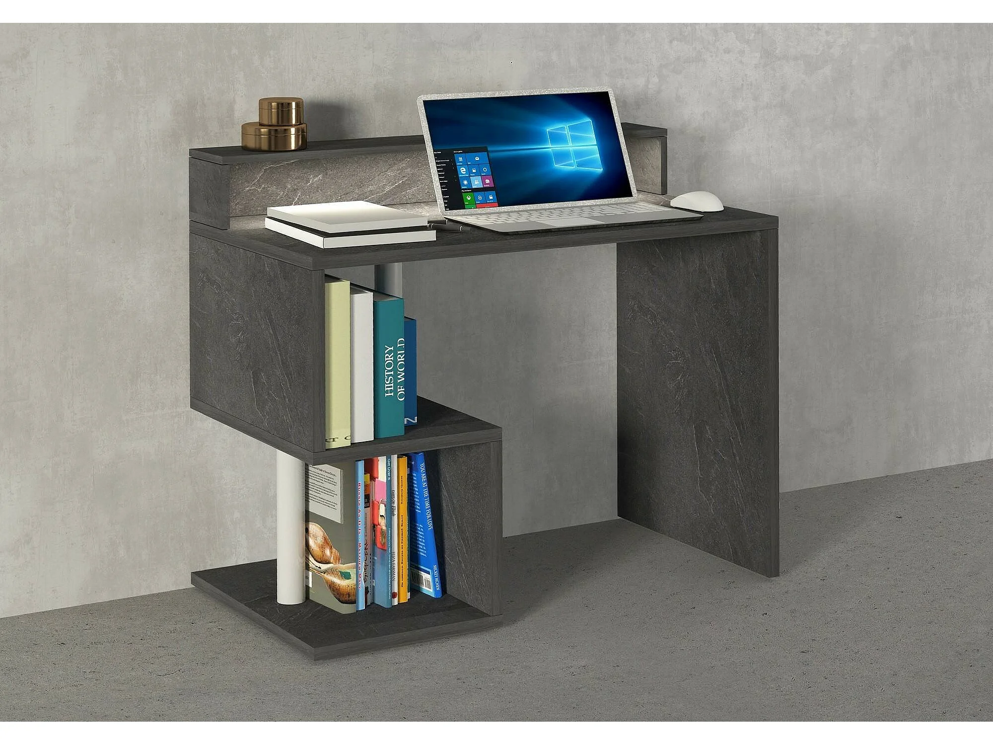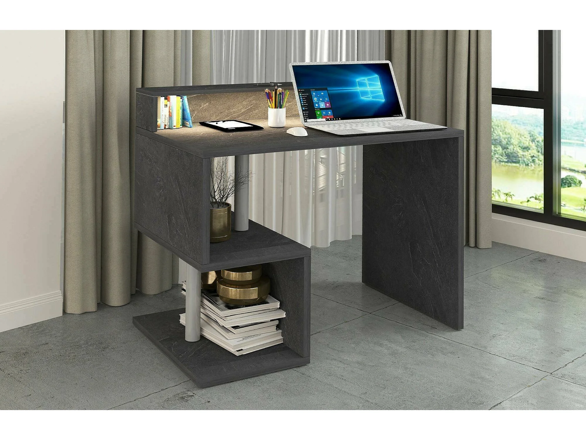 Dcalafior Bureau, Lineair Bureau met Opbergplanken en LED Verlichting, Multifunctioneel Bureau met Ouverture, 100x50h93 cm, Leisteen