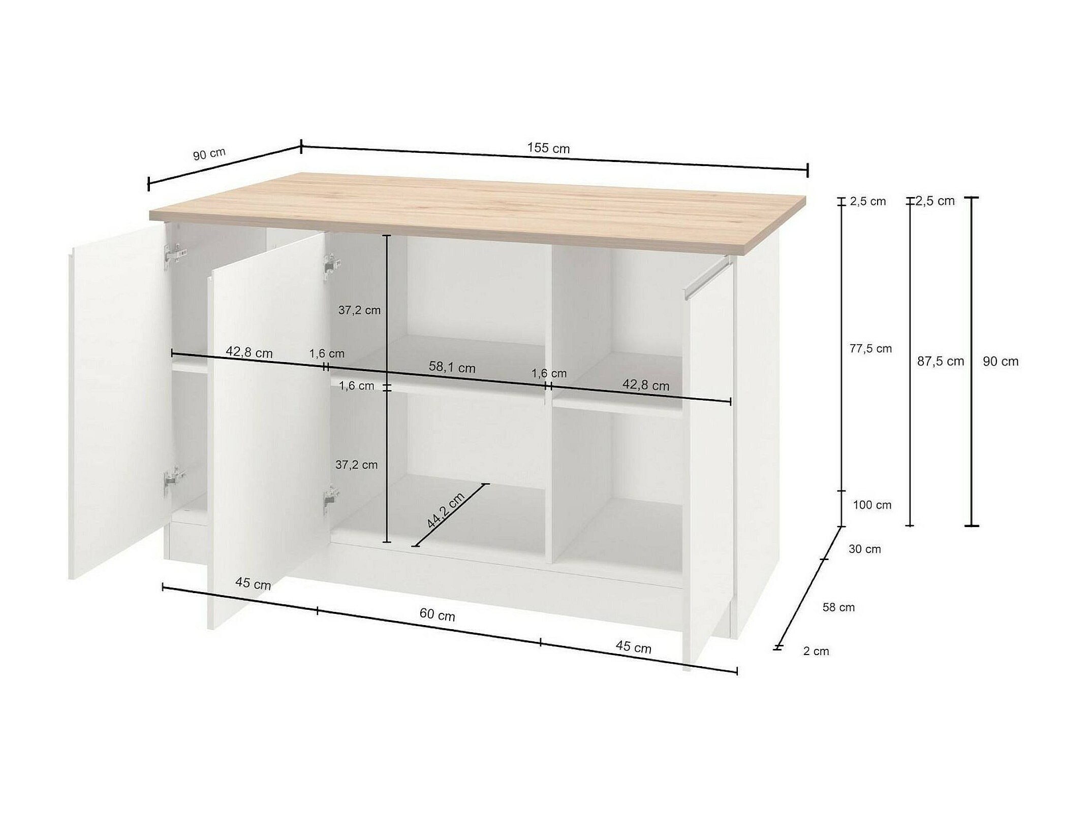 Modern kookeiland met houten blad, 3 lades, grenen mand, multifunctionele opbergfunctie, wit (120x45x90 cm)