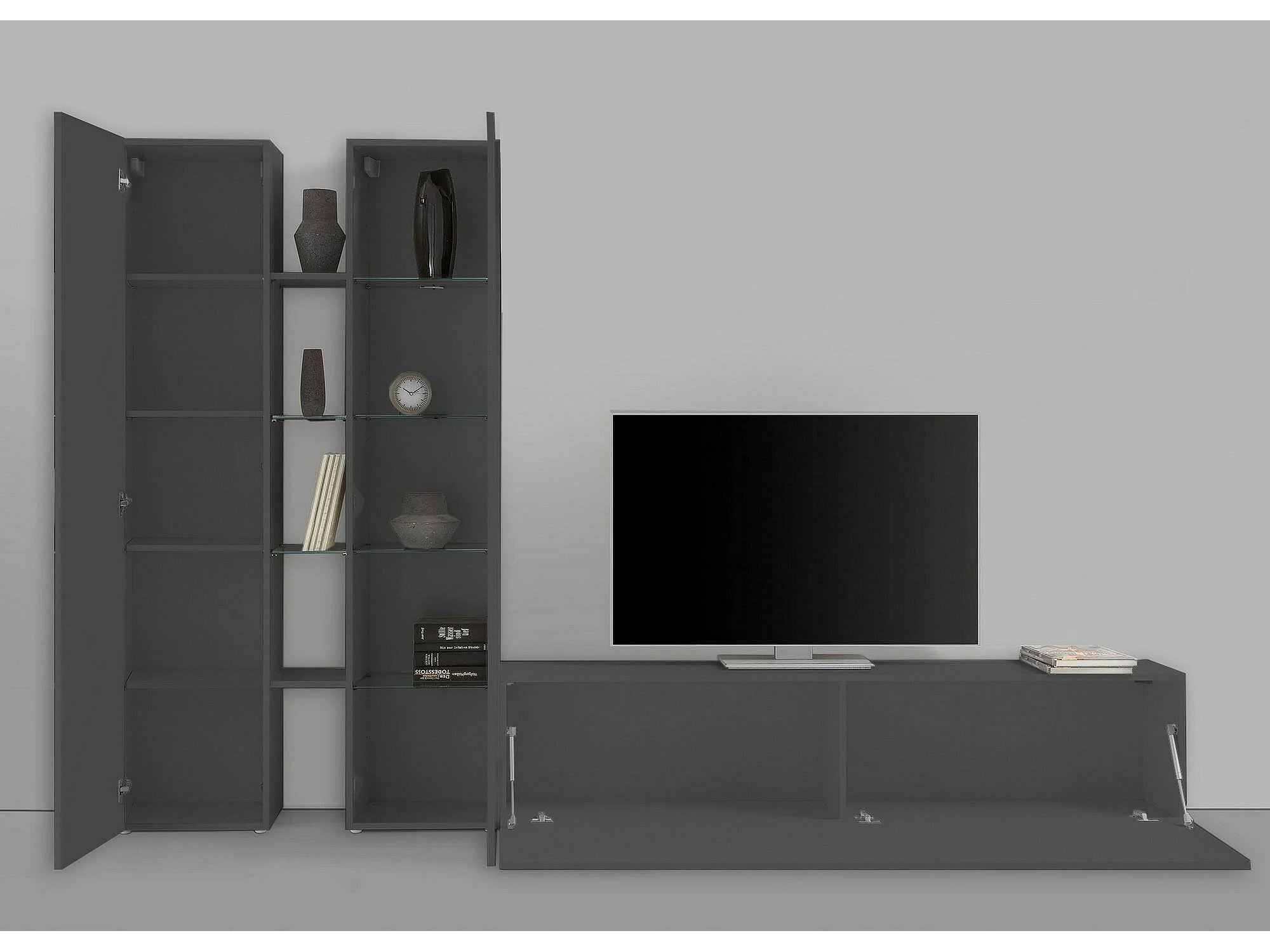 Dcau wandsysteem, 3-deurs TV-meubel woonkamerset, Multifunctioneel woonkamermeubel met vitrine en LED-licht, 100% Made in Italy, 280x30h180 cm, Antraciet