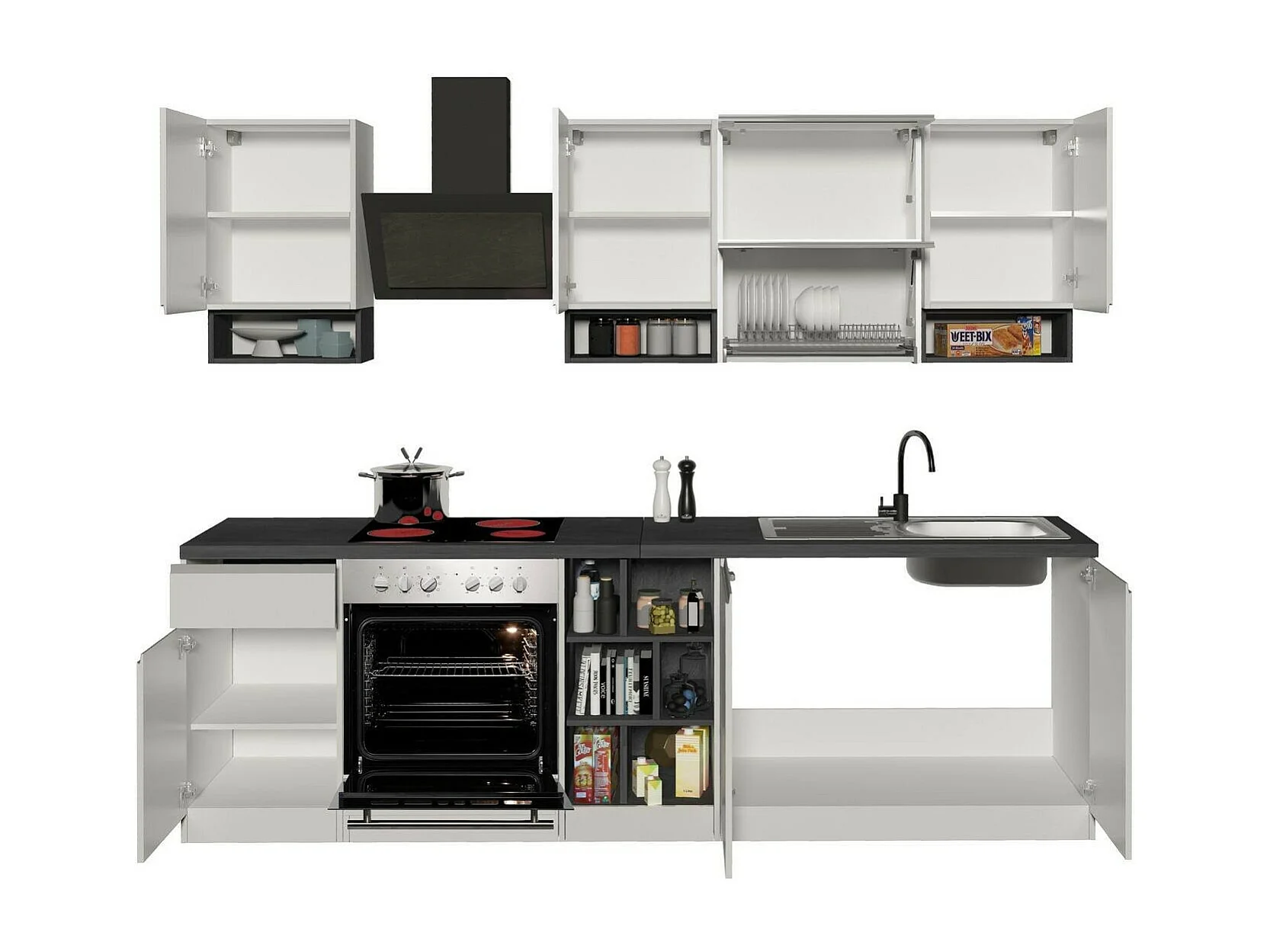 Dceccaron complete keuken, Set met bijkeuken, Keukenkast, Lineaire blokkit, 100% Made in Italy, 255x60h85 cm, Glanzend wit en leisteen