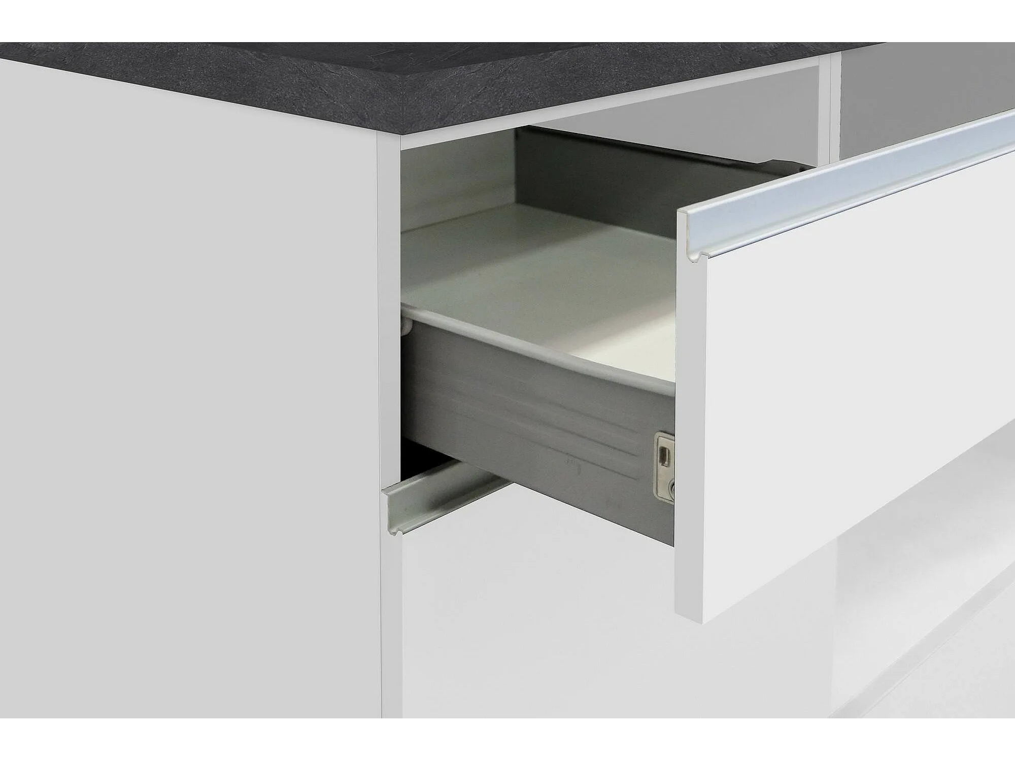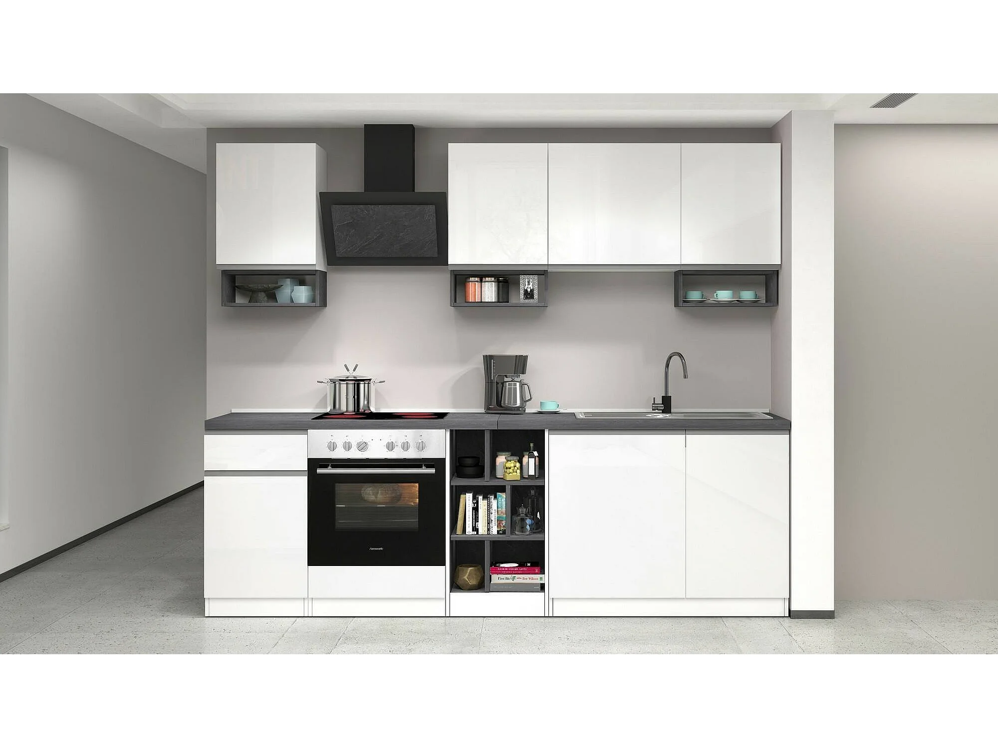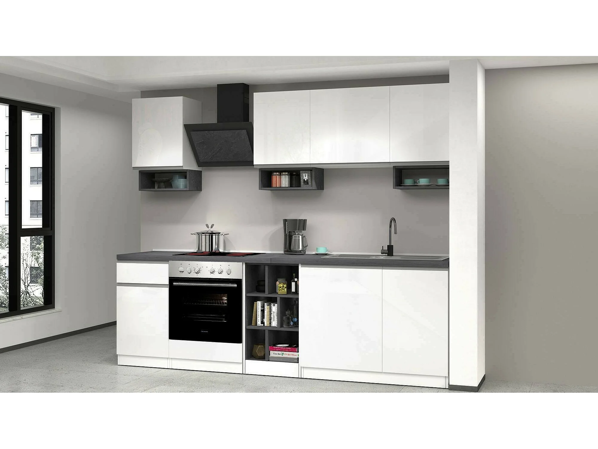 Dceccaron complete keuken, Set met bijkeuken, Keukenkast, Lineaire blokkit, 100% Made in Italy, 255x60h85 cm, Glanzend wit en leisteen