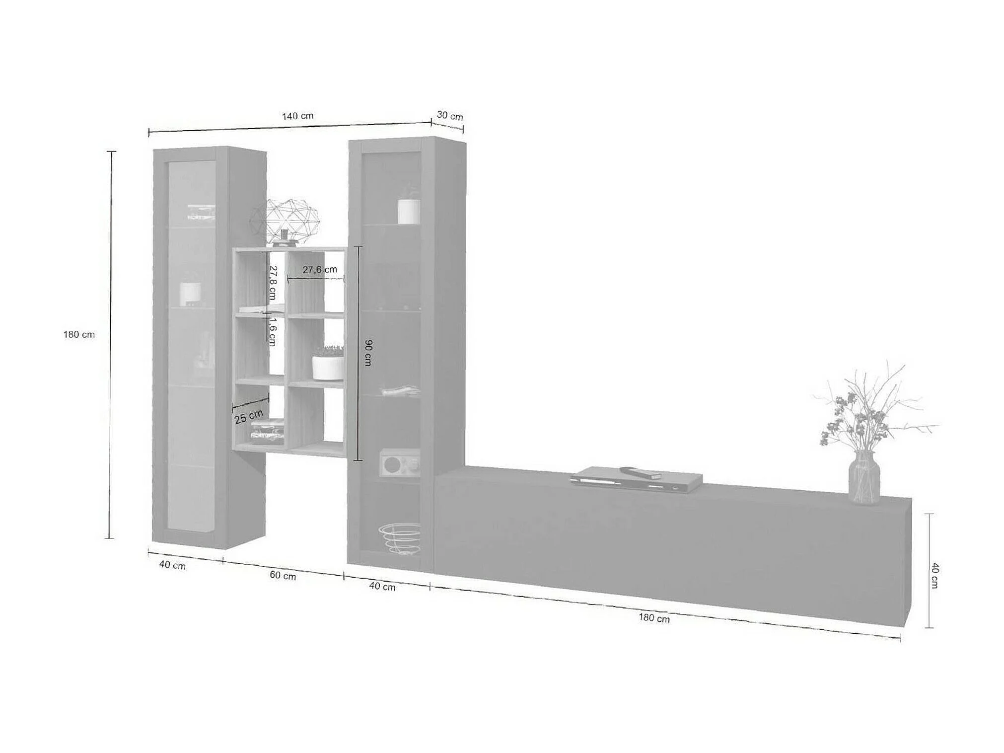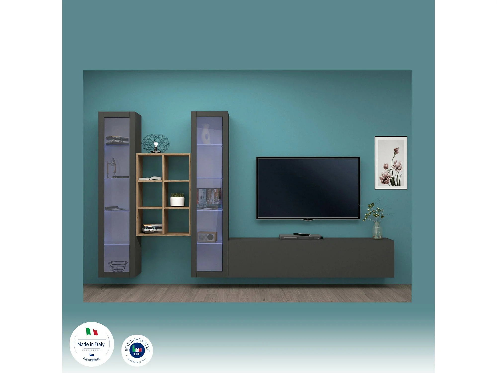Dcorrei wandsysteem, 3-deurs TV-meubel woonkamerset, Multifunctioneel woonkamermeubel met vitrine en LED-licht, 100% Made in Italy, 320x30h180 cm, Antraciet