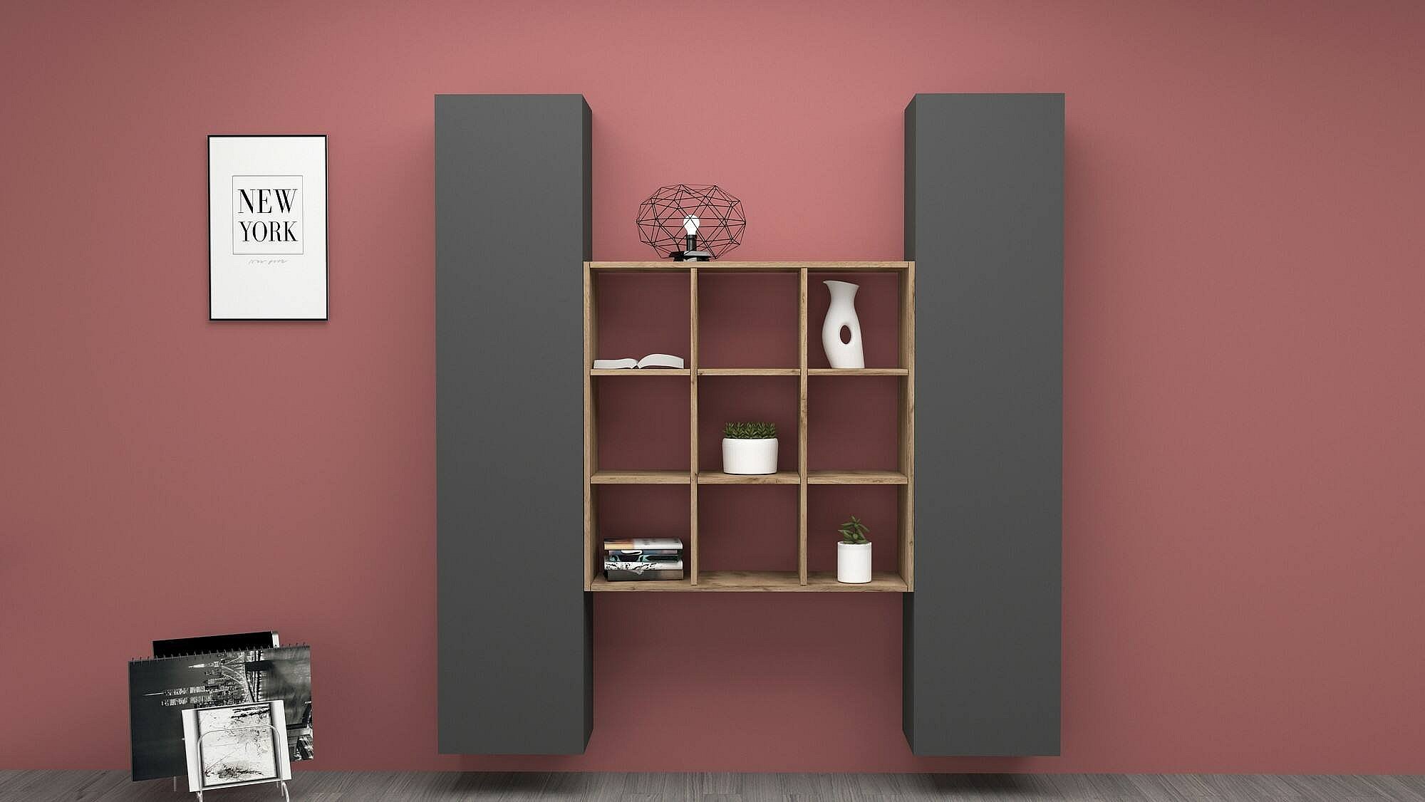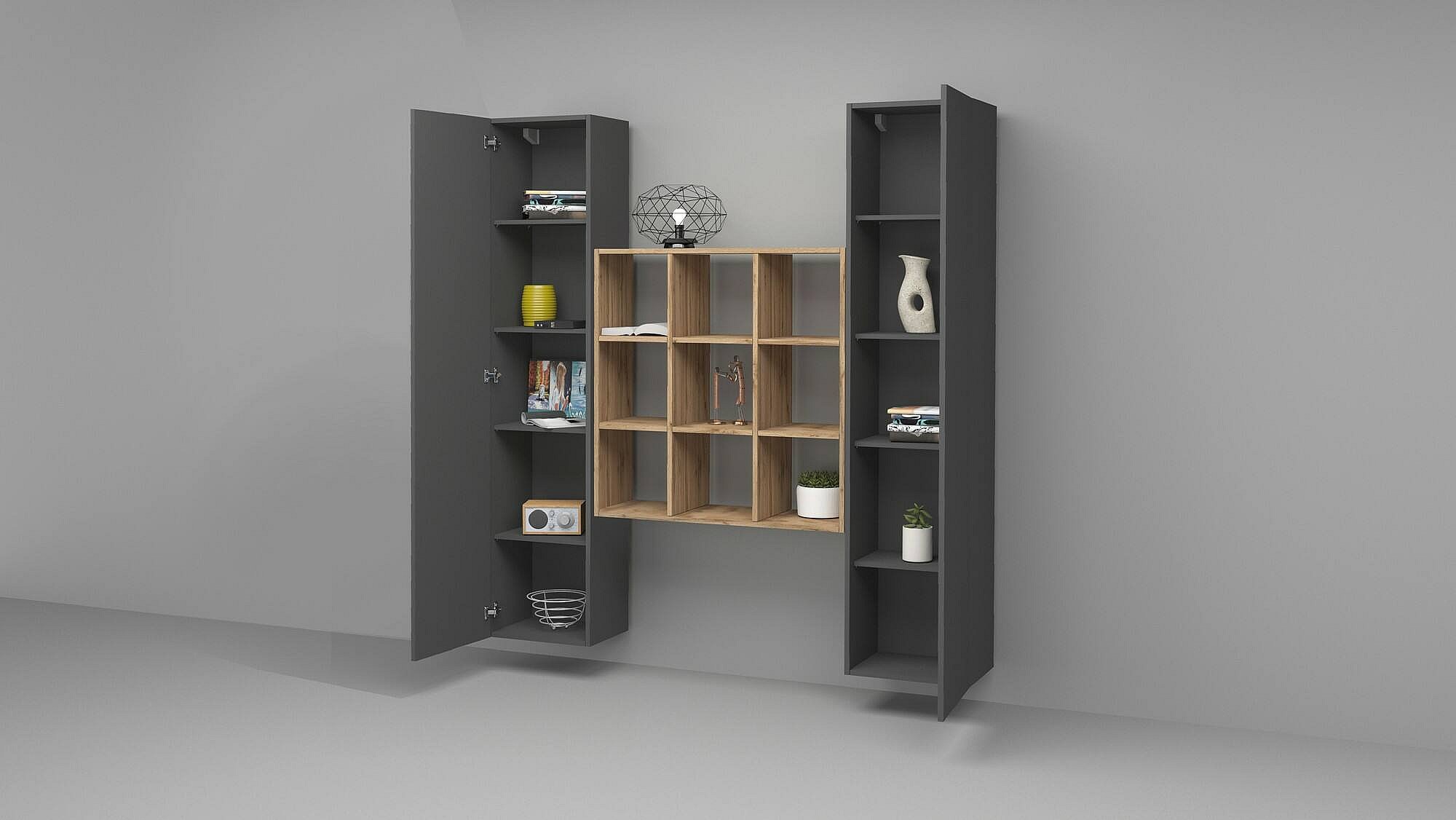 Ddacru Dressoir, Woonkamerset met 2 deuren en planken, Woonkamerbuffet, Keukendressoir, 100% Made in Italy, 170x30h180 cm, Antraciet en Esdoorn