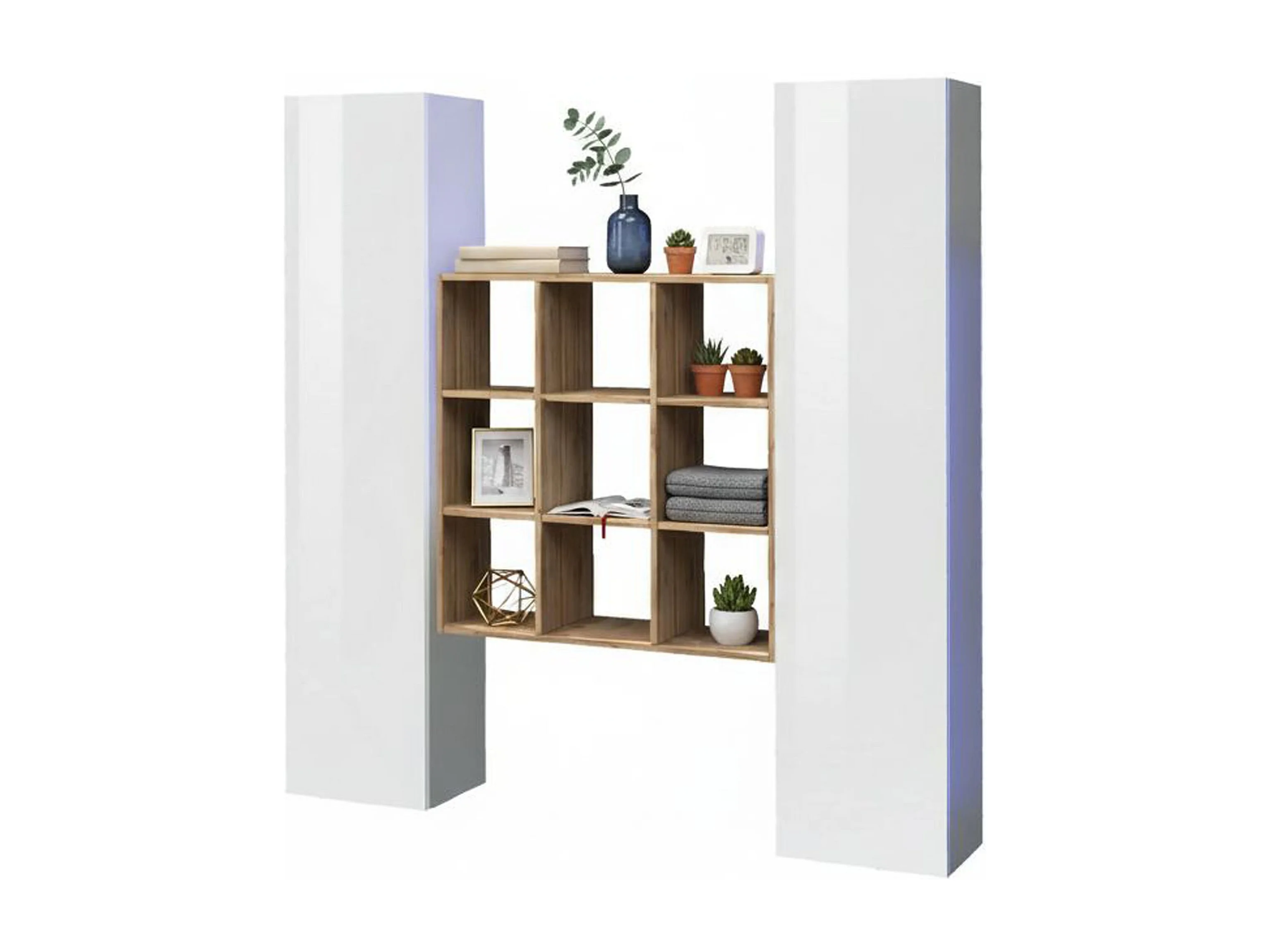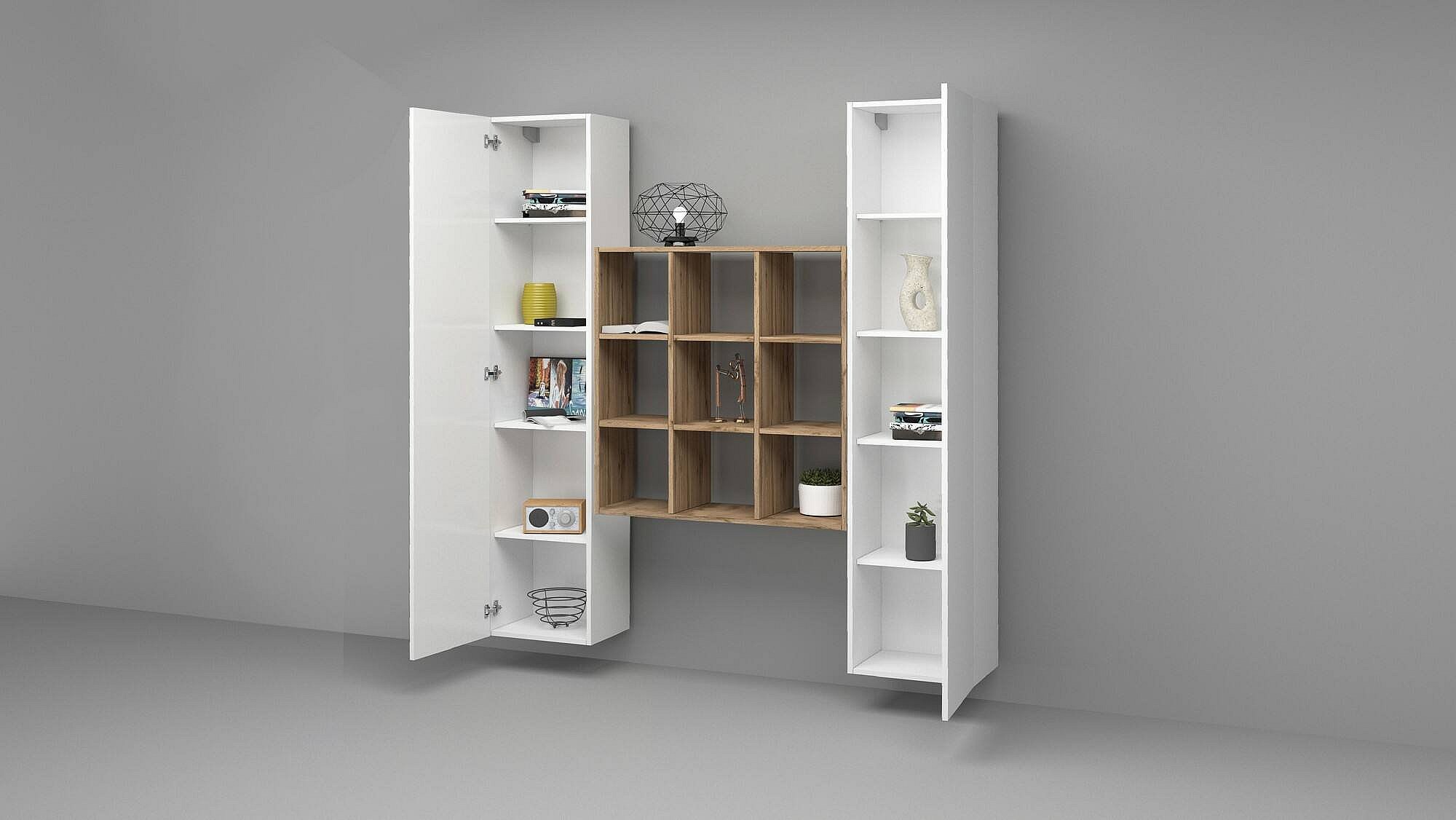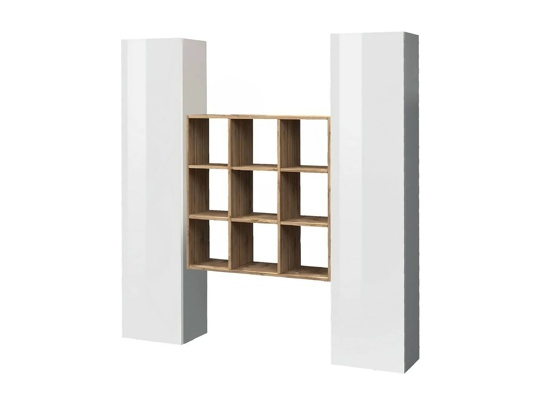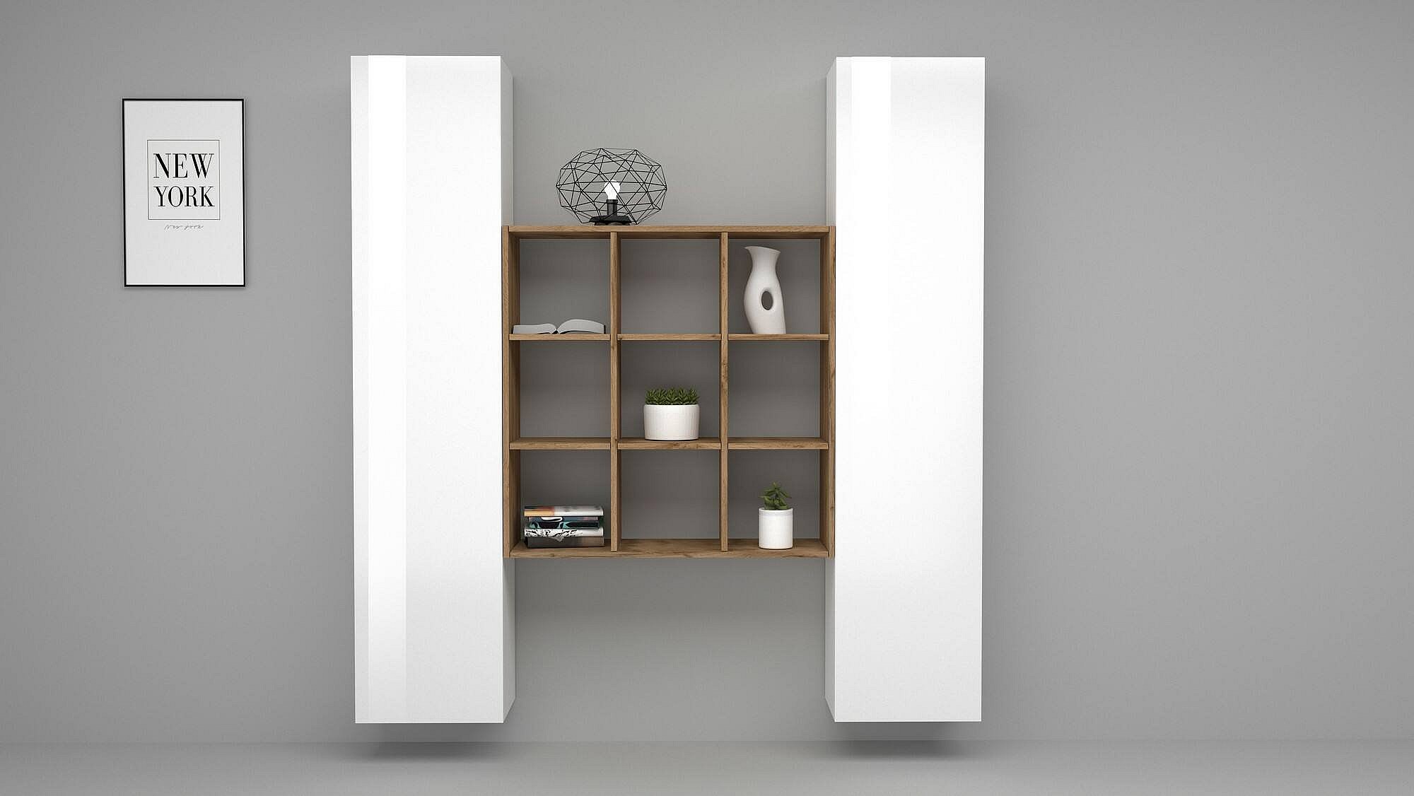 Ddacru Dressoir, Woonkamerset met 2 deuren en planken, Woonkamerbuffet, Keukendressoir, 100% Made in Italy, 170x30h180 cm, Glanzend wit en Esdoorn