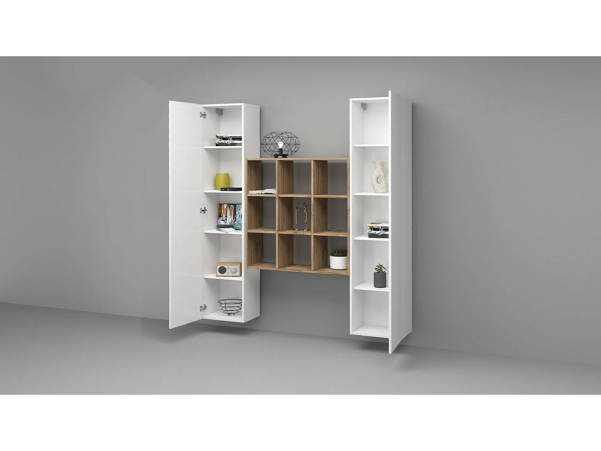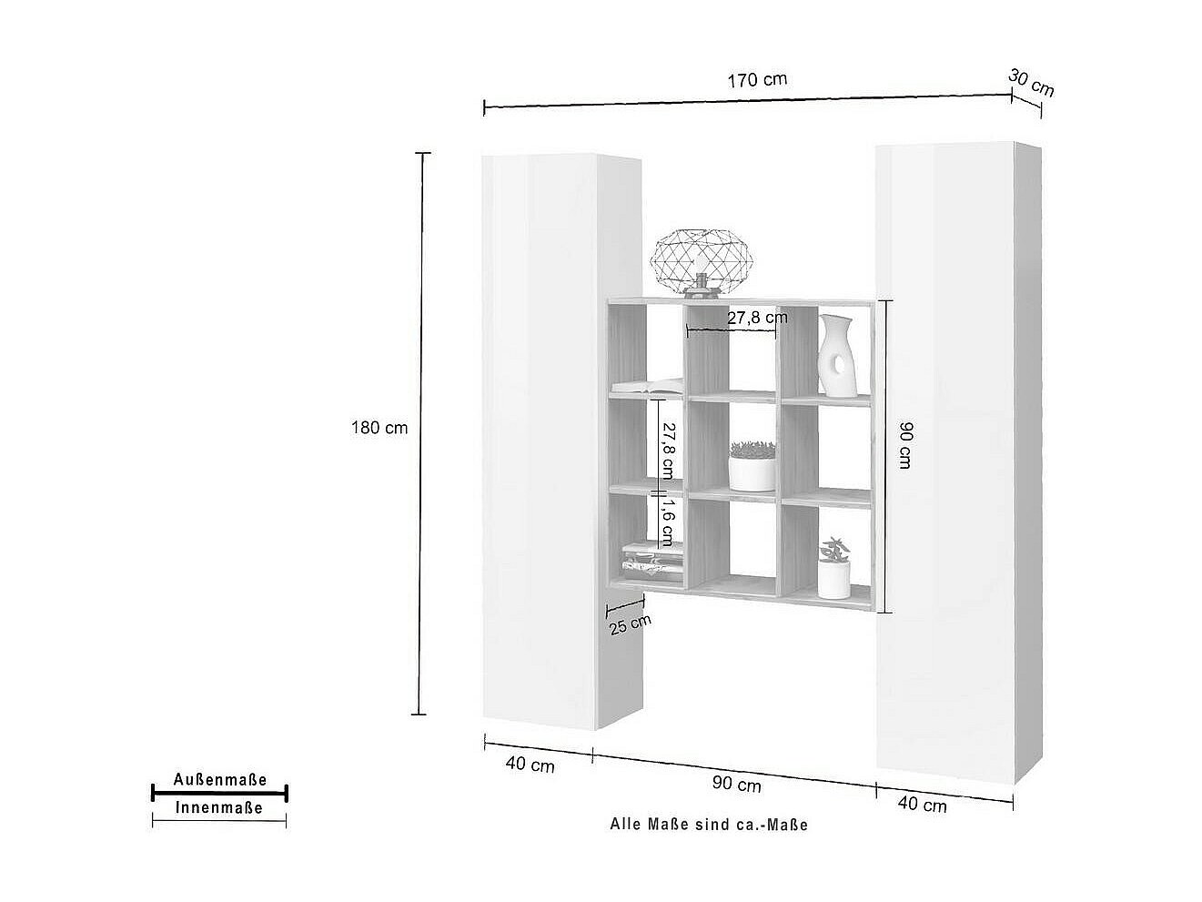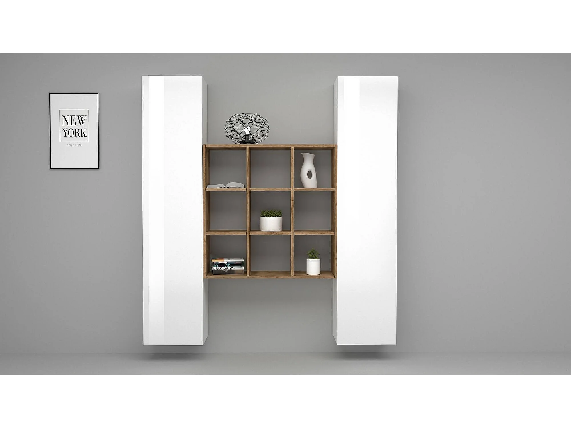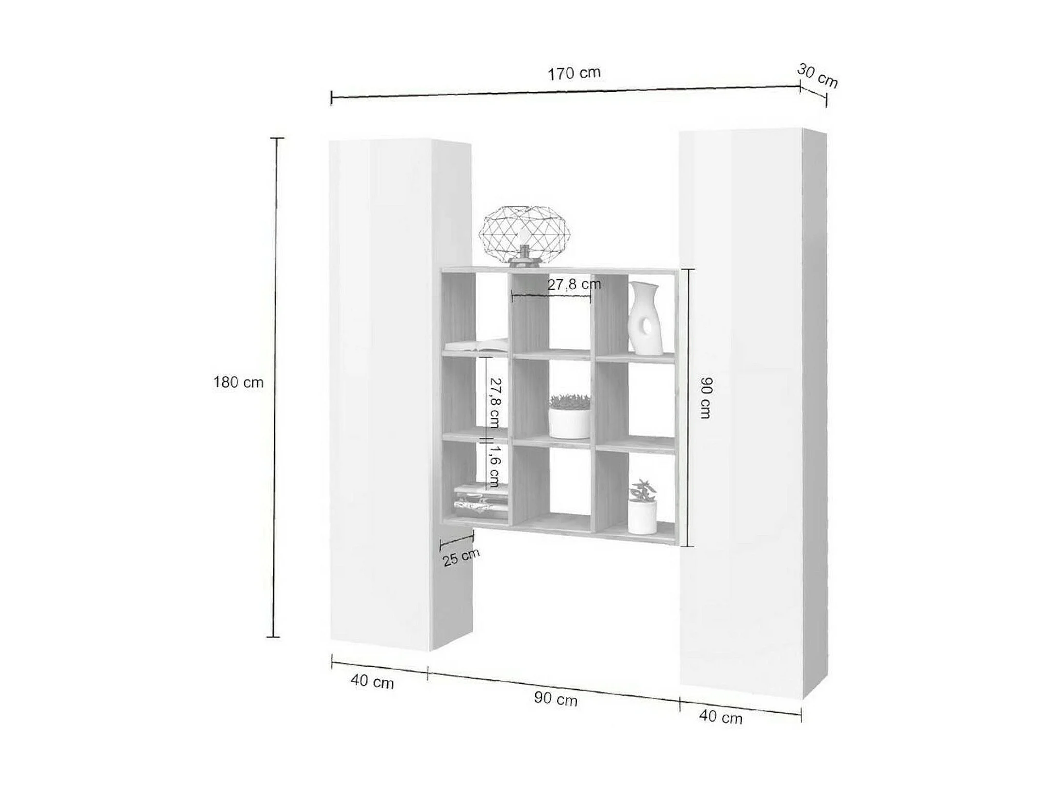 Ddacru Dressoir, Woonkamerset met 2 deuren en planken, Woonkamerbuffet, Keukendressoir, 100% Made in Italy, 170x30h180 cm, Glanzend wit en Esdoorn