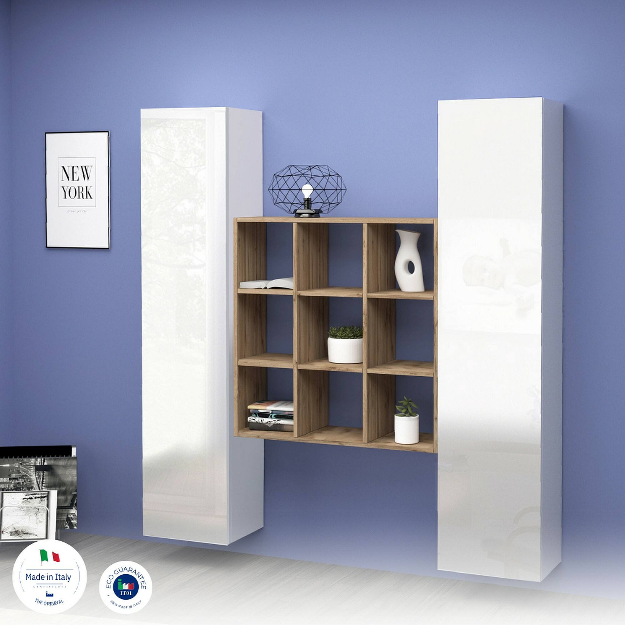 Ddeluc Dressoir, Woonkamerset met 2 deuren en planken, Woonkamerbuffet, Keukendressoir, 100% Made in Italy, 140x30h180 cm, Glanzend wit en Esdoorn
