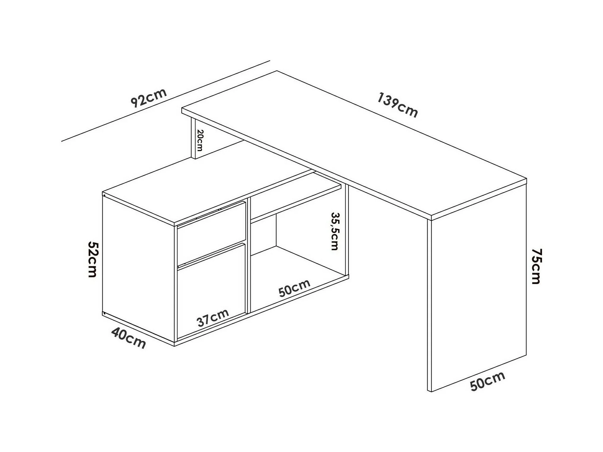 Dmorlup Bureau, multifunctioneel omkeerbaar bureau met meerdere posities, studeer- of kantoortafel voor pc met plank, 136x139h74 cm, wit en cement