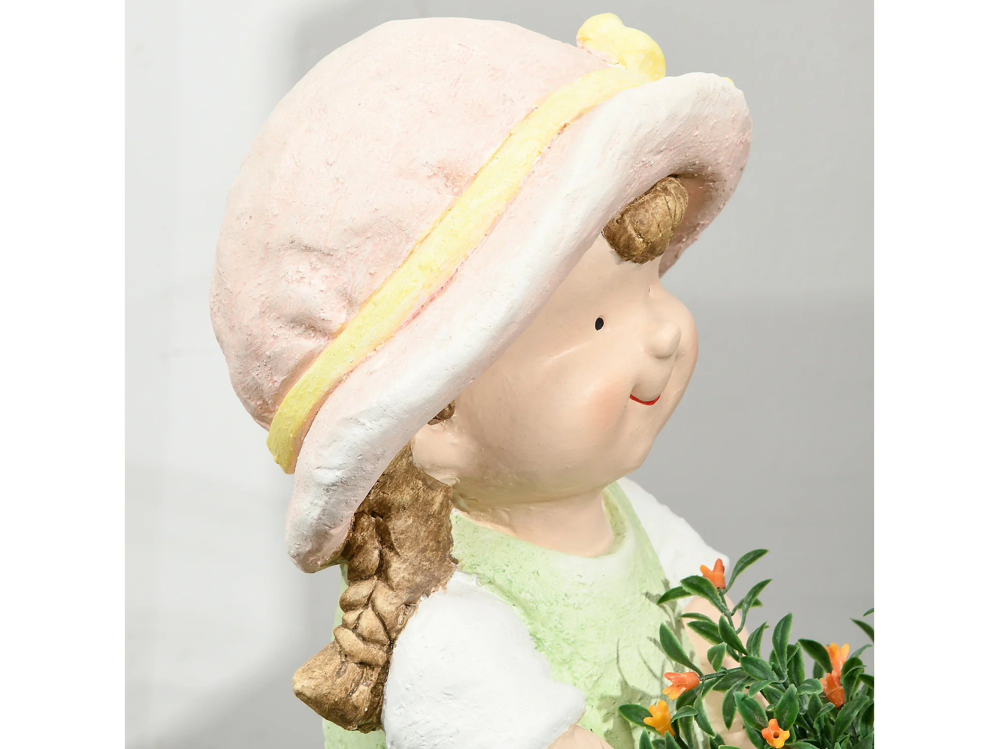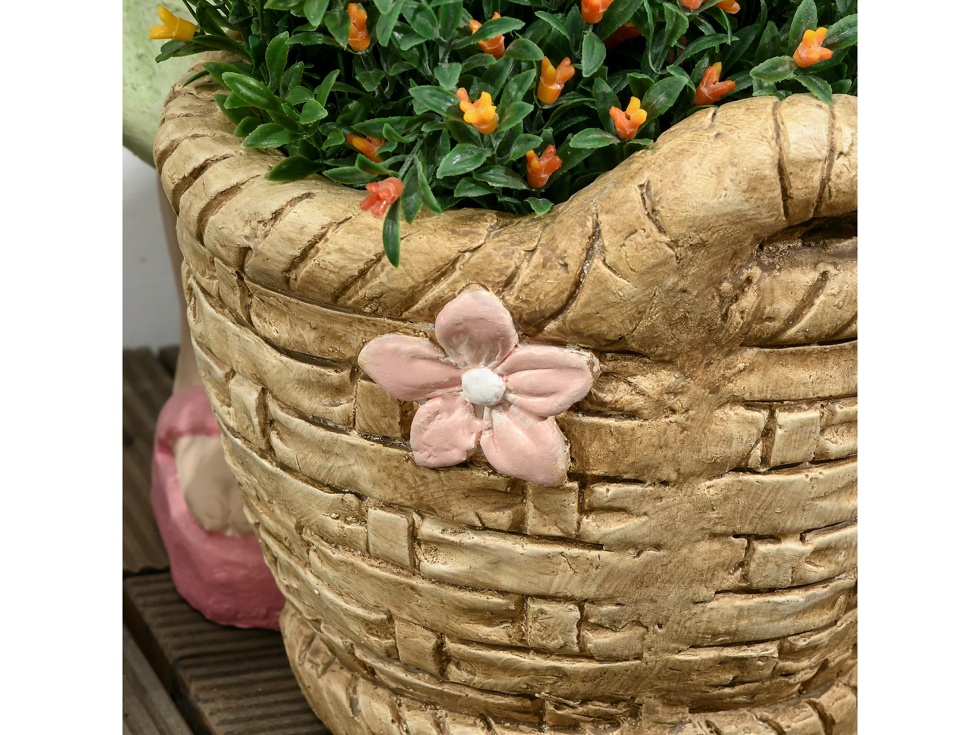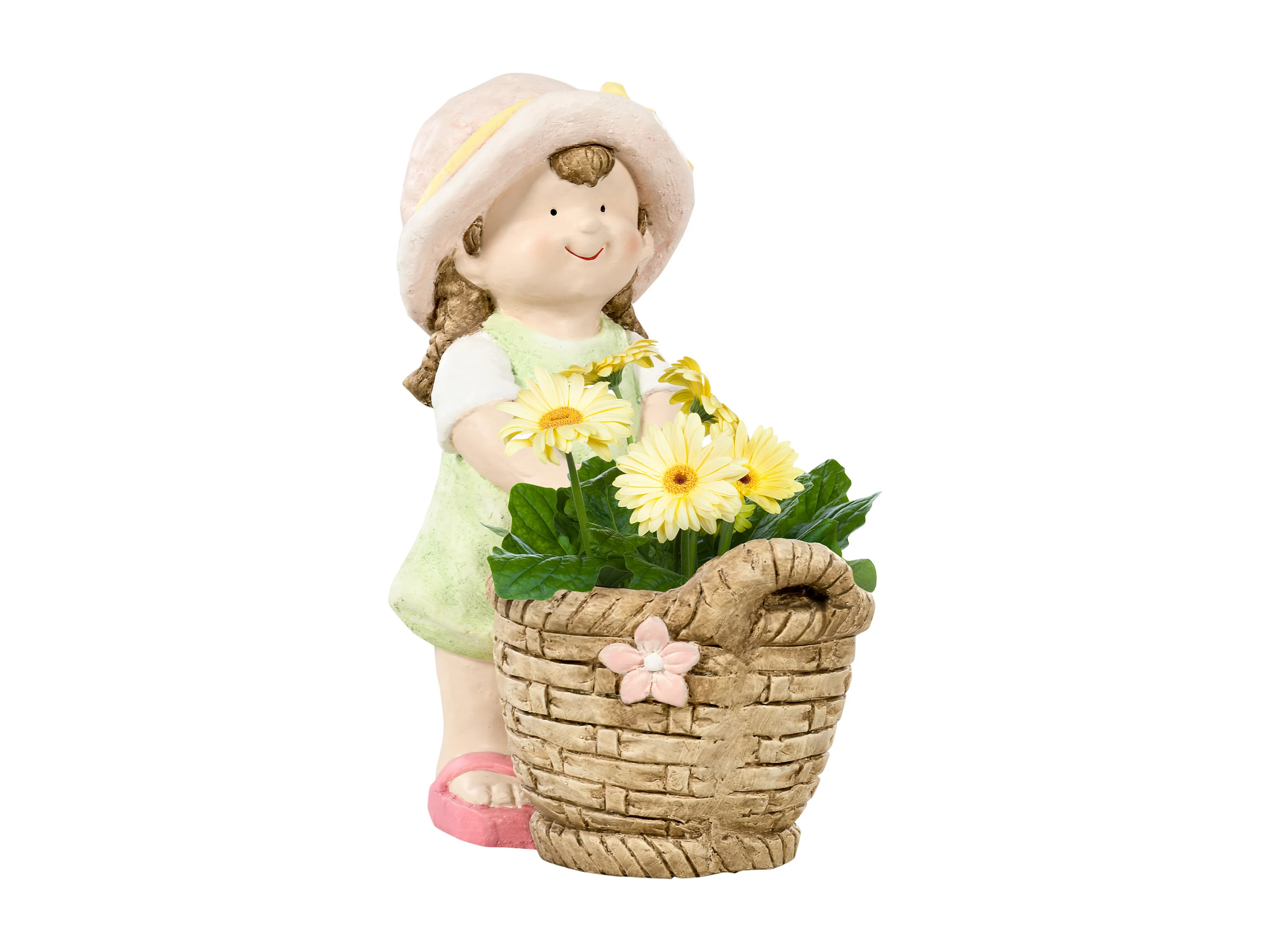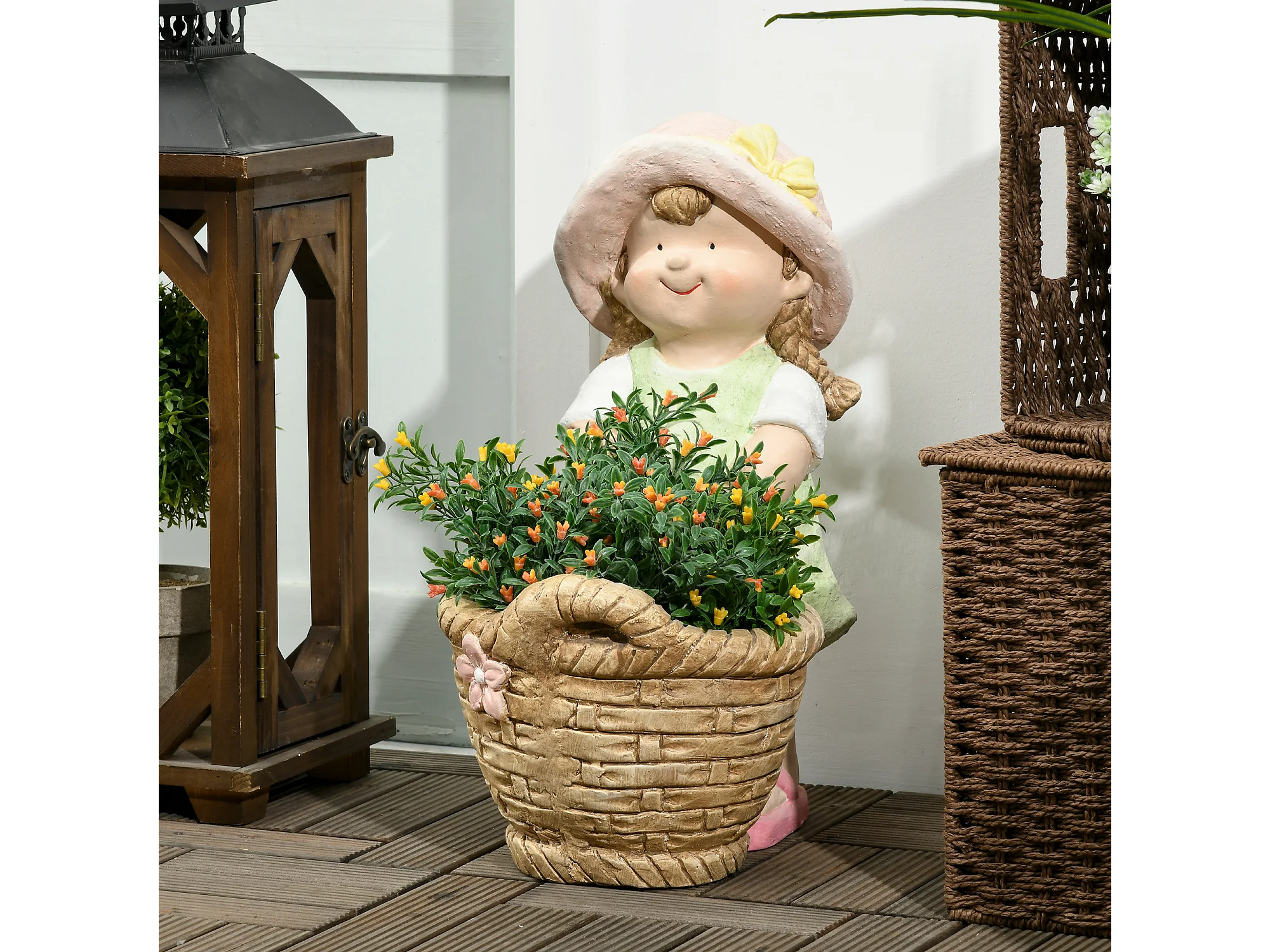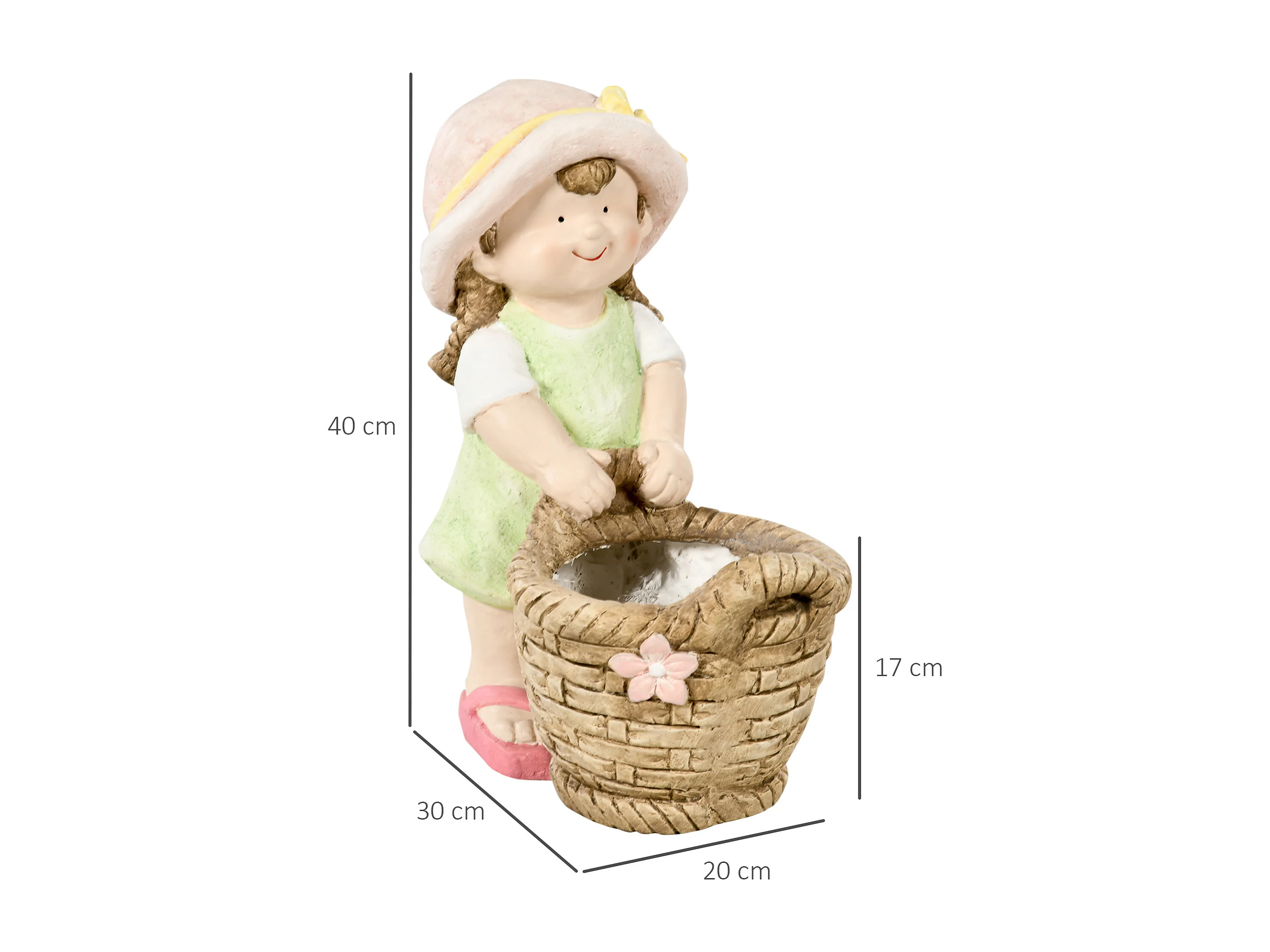 Decoratief beeldje meisje met bloemenmand, gemaakt van magnesiumoxide, veelkleurig, voor tuin en interieur (20x30x40 cm)