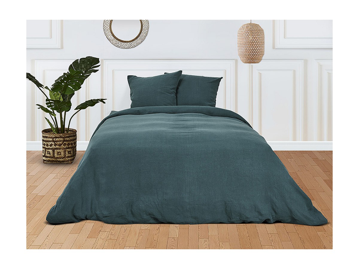 Dekbedovertrekset FIGUIERA - Dekbedovertrek 260 x 220 cm + 2 kussenslopen 65 x 65 cm - 100% linnen - Donkergroen
