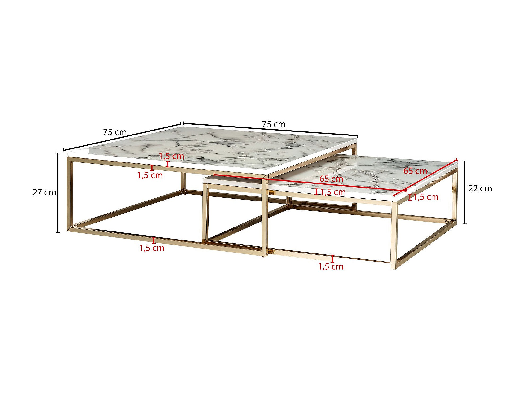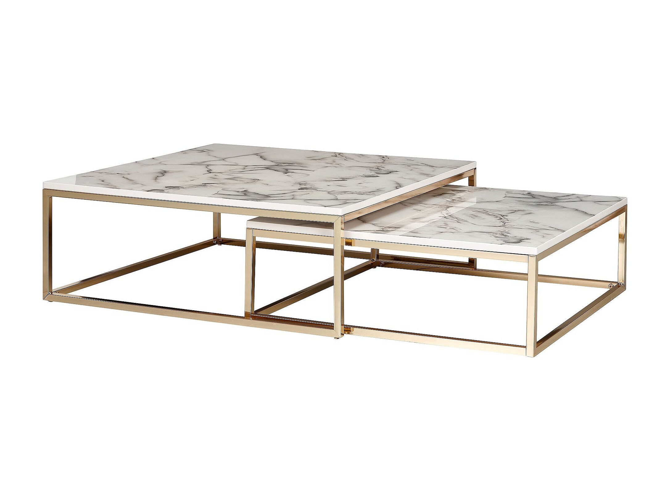 design salontafel set van 2 wit marmer optiek hoekig | Salontafels 2-delig tafelframe metaal goud | Edele salontafels | Moderne nesttafels