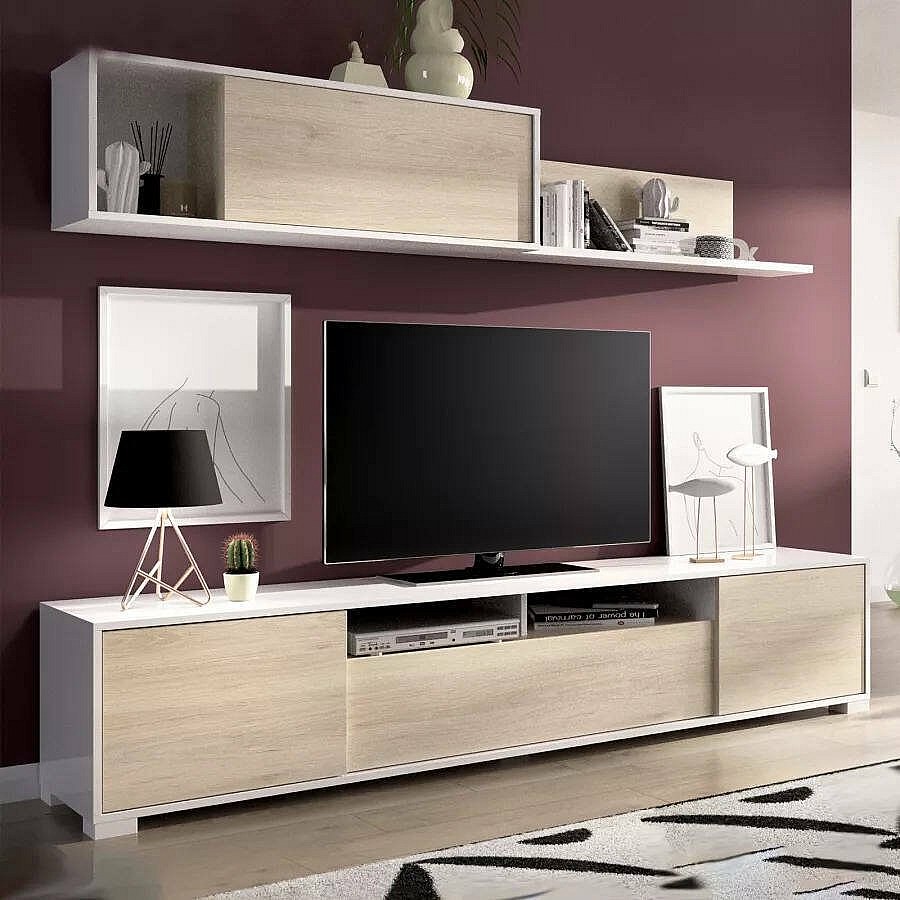 Dfalcon wandsysteem, TV-meubel woonkamerset, Multifunctioneel woonkamermeubilair, 200x41h180 cm, Eiken en Wit