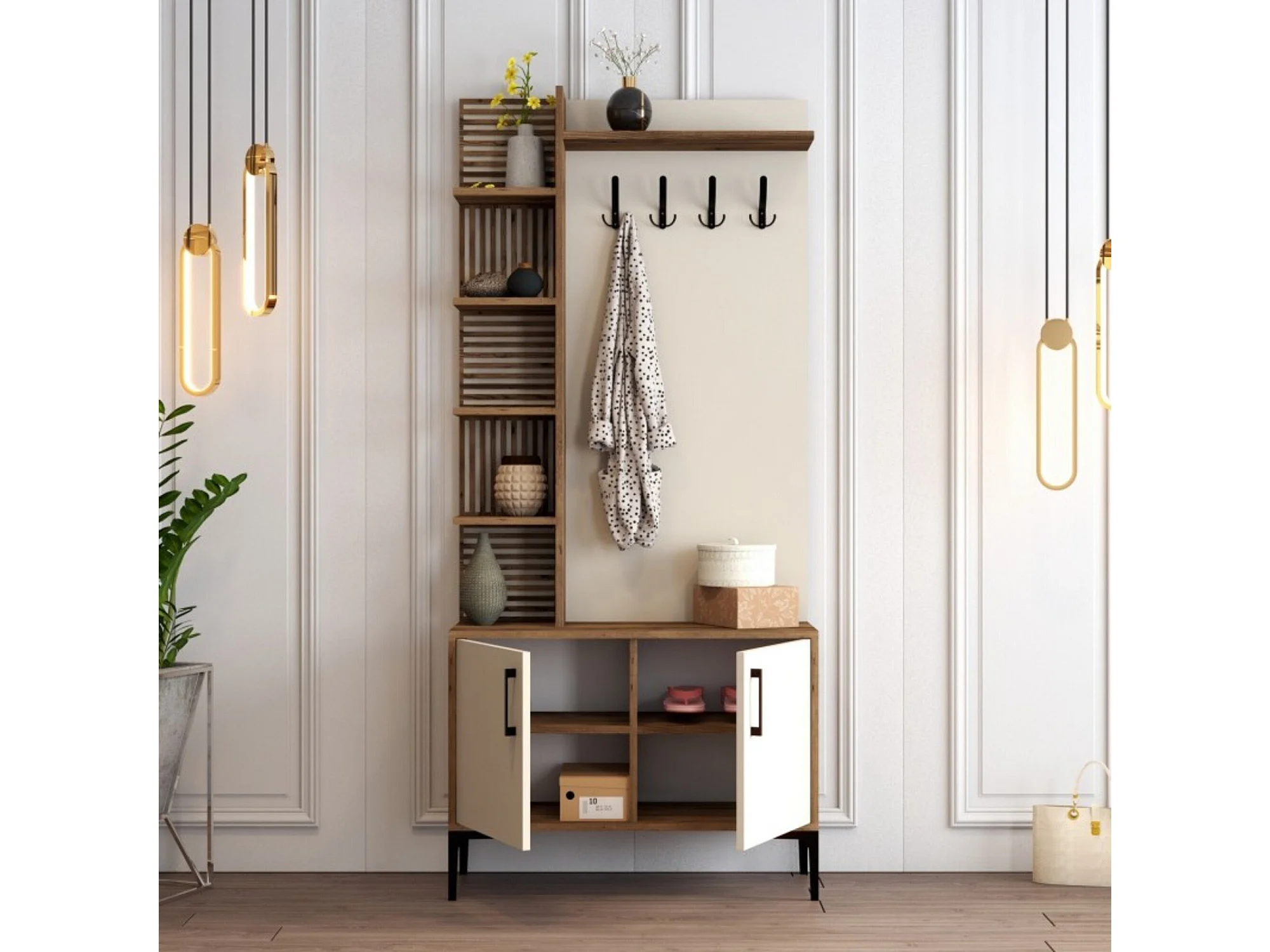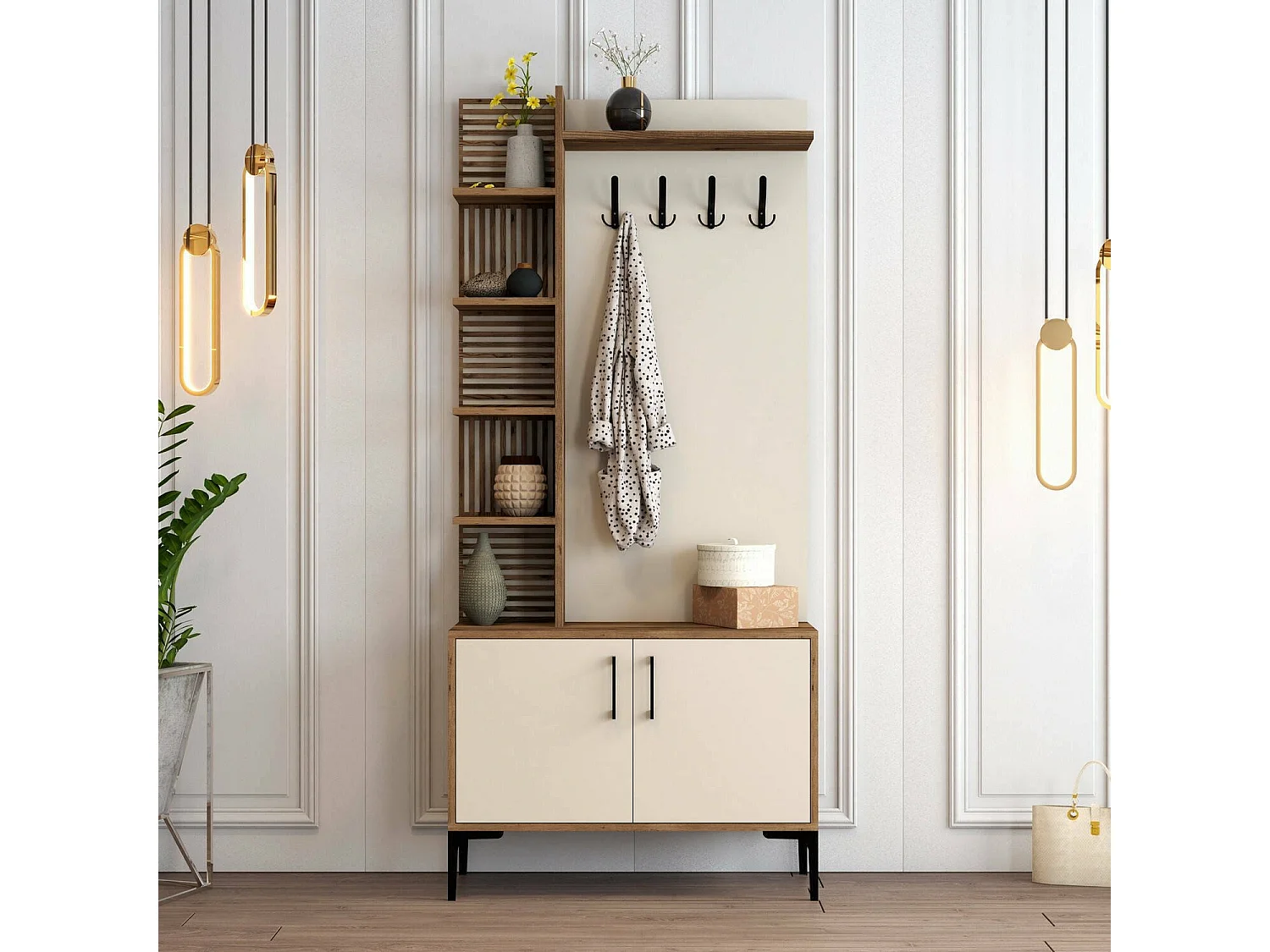 Dfilipporeal entreemeubilair, Kleerhanger entree, Entree compositie, Multifunctionele opbergconsole, 90x35 h200 cm, Walnoot en Crème