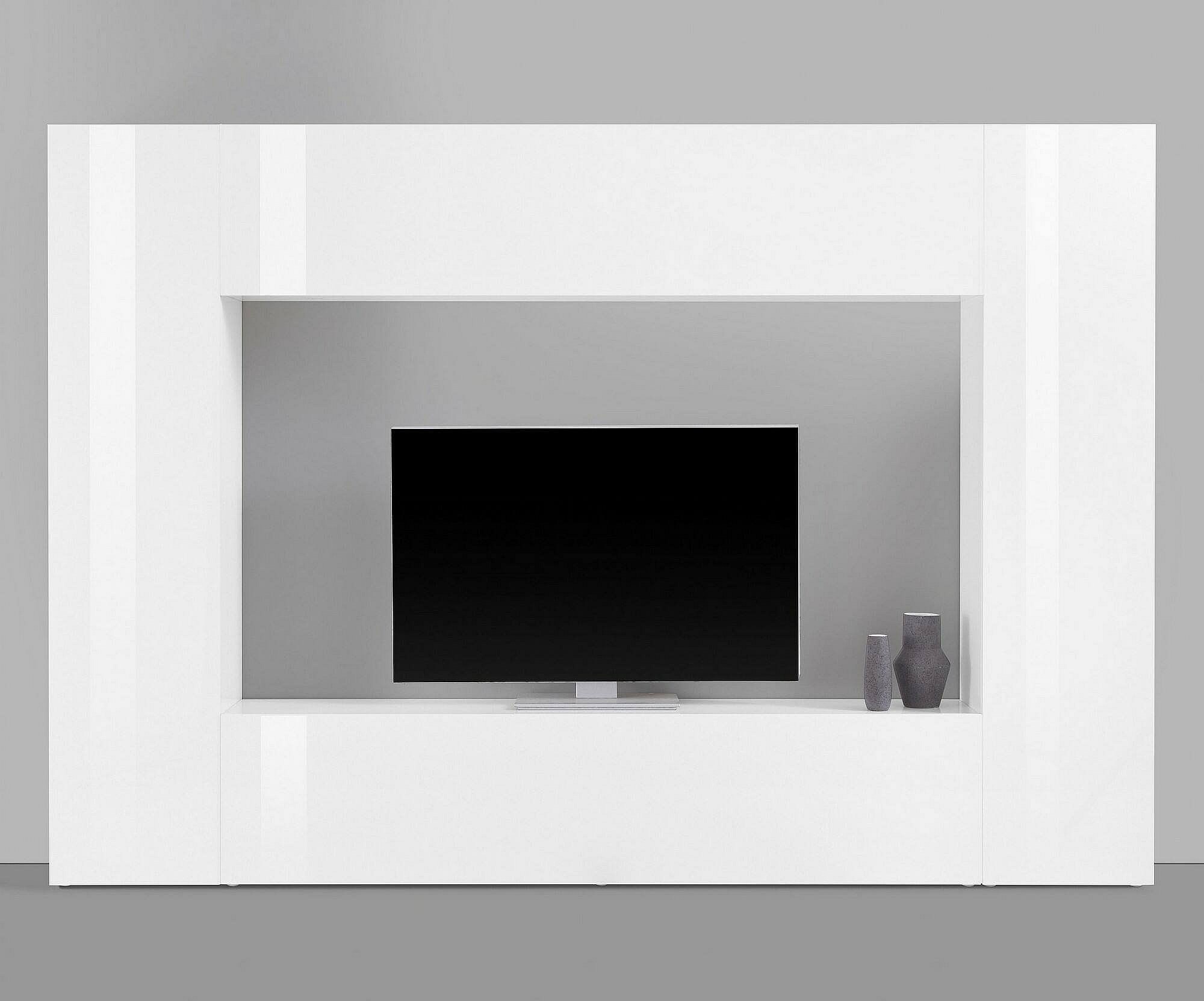Dgirm wandsysteem, 4-deurs TV-meubel woonkamerset, Multifunctioneel woonkamermeubilair, 100% Made in Italy, 260x30h180 cm, Glanzend wit
