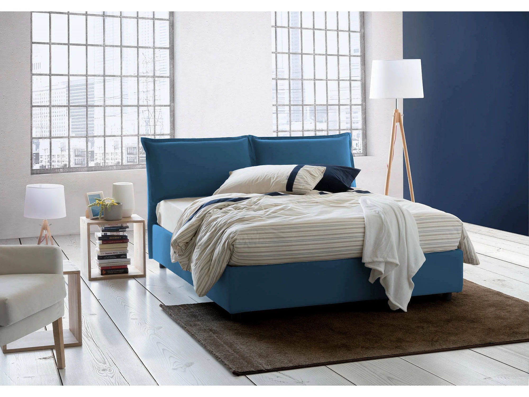 Dgnahor tweepersoonsbed, Opbergbed met stoffen bekleding, 100% Made in Italy, Opening aan de voorkant, geschikt voor matras van 140x200 cm, Blauw