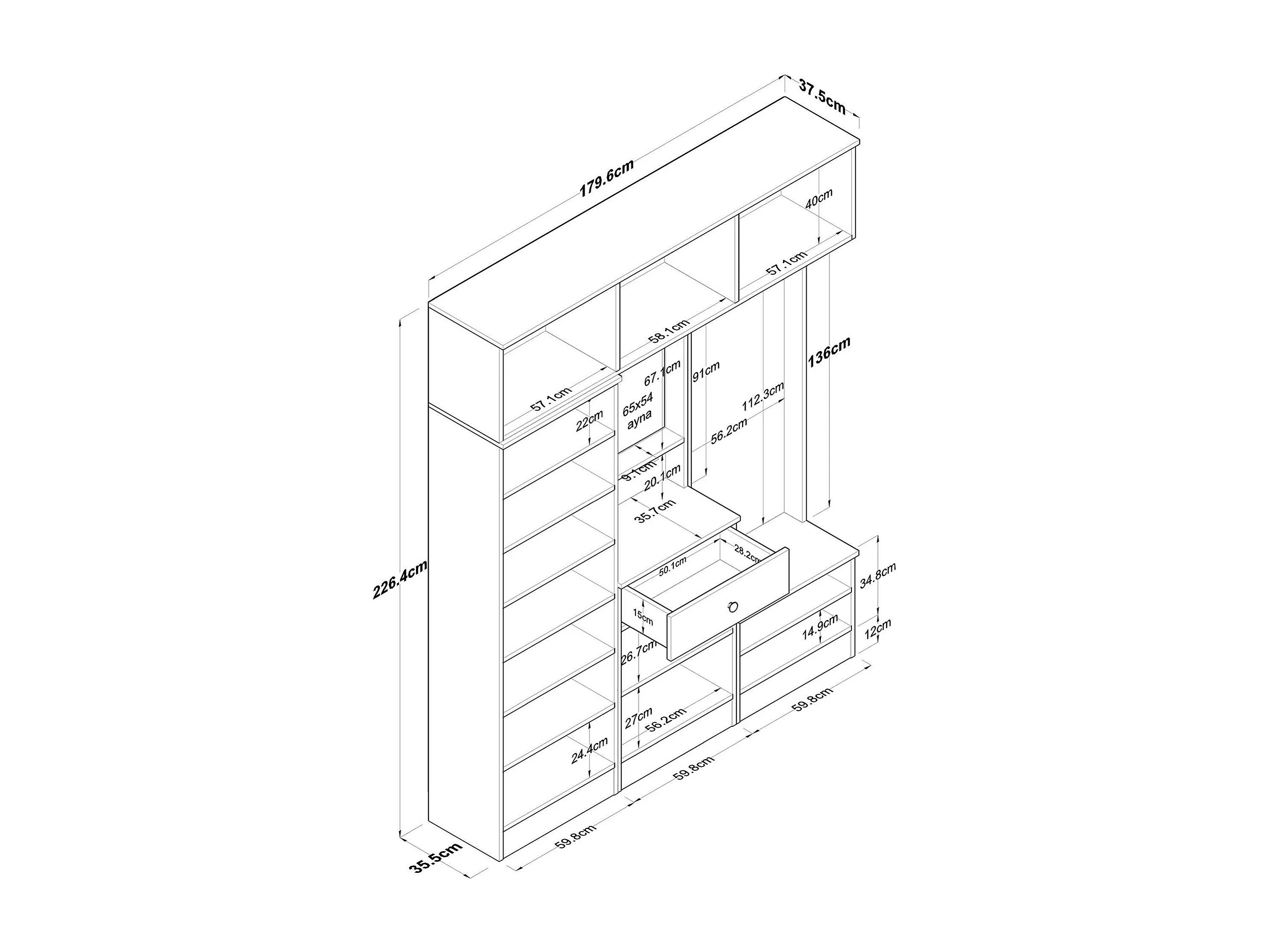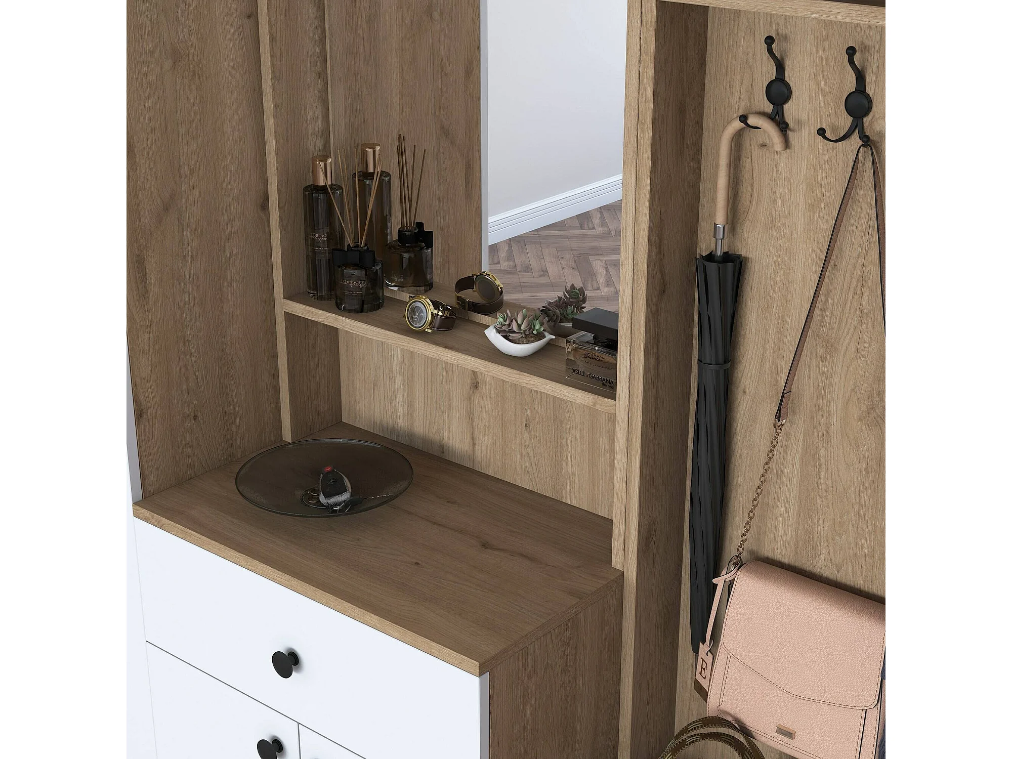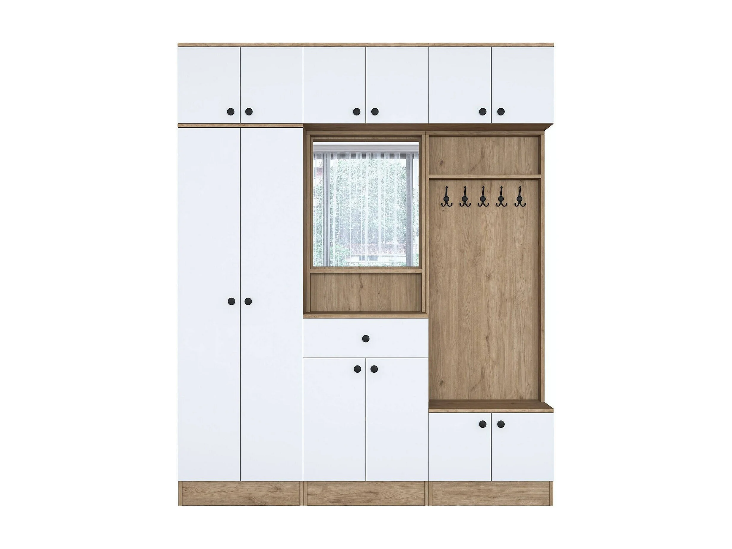 Dhermannsso entreemeubilair, Kleerhanger entree, Entree compositie, Multifunctionele opbergconsole, 180x38 h226 cm, Walnoot en Wit