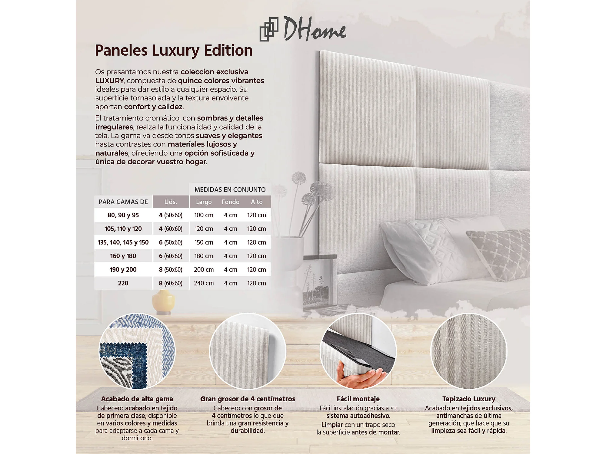 DHOME Gestoffeerd hoofdbord bestaande uit verwisselbare zelfklevende panelen Luxury Edition Serie Luxe bed Slaapkamer (Cream, 220cm)