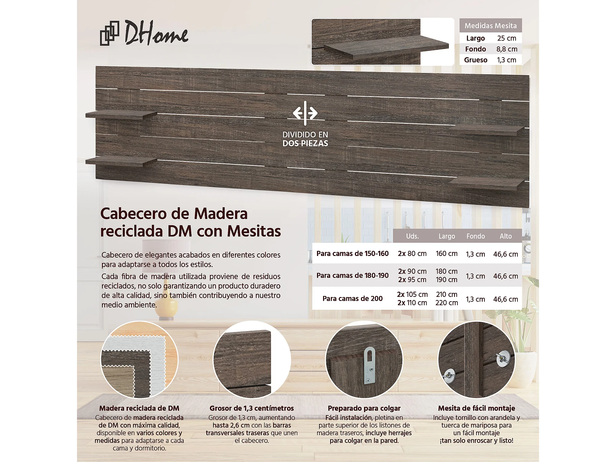 DHOME Hoofdeinde van gerecycled hout Dm Japanse stijl met poten 80x115cm bedden 80 - Amazon Oak