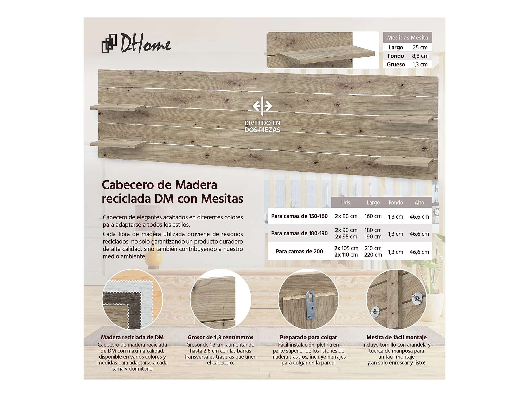 DHOME Hoofdbord met planken van gerecycled hout DM Muurhangend Horizontaal palletstijl Scandinavisch vintage bed (270 cm eiken)