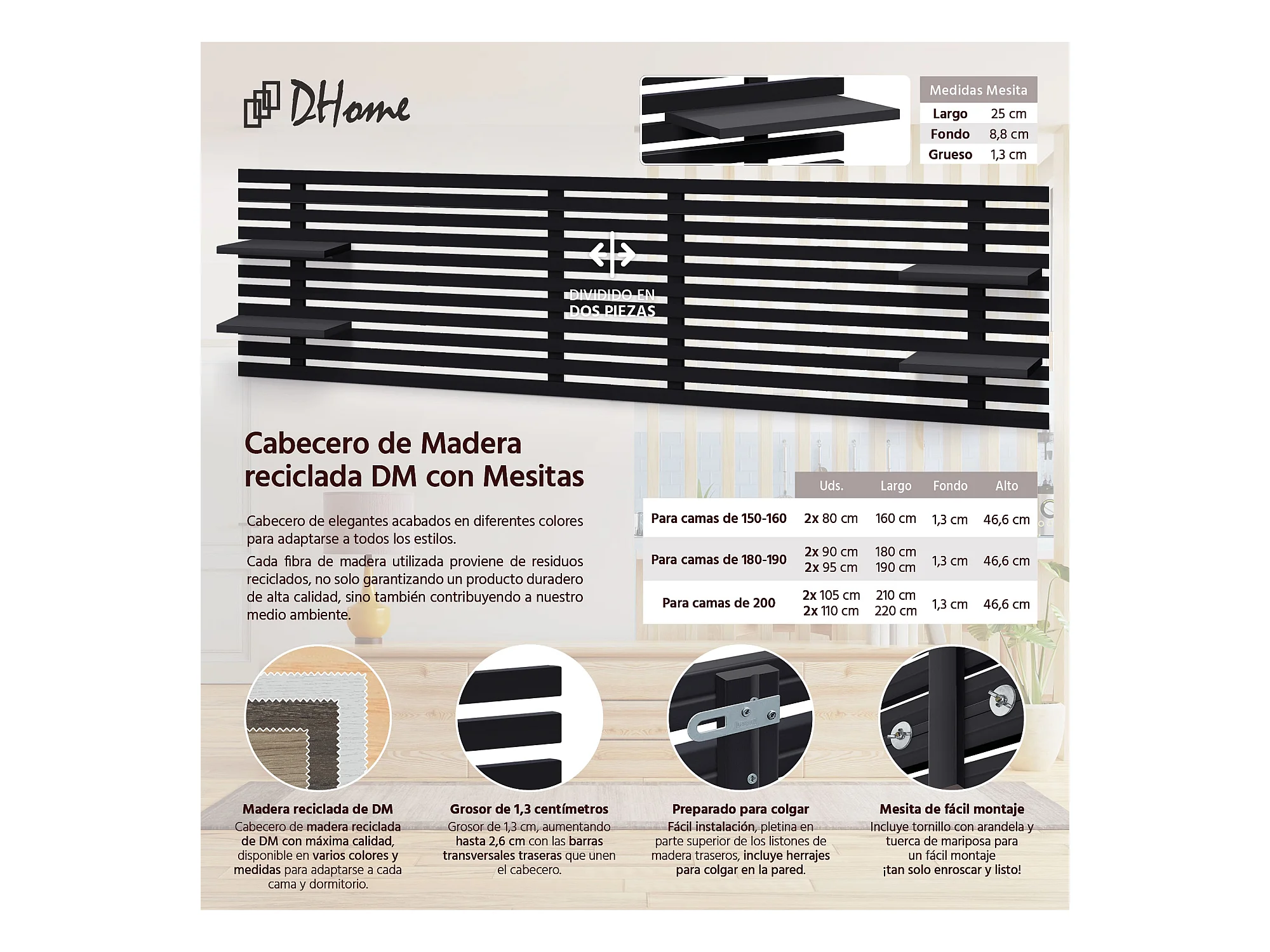 DHOME Hoofdbord met planken van gerecycled hout DM muurhangend horizontaal palletstijl met poten Scandinavisch vintage bed (210 cm effen zwart)