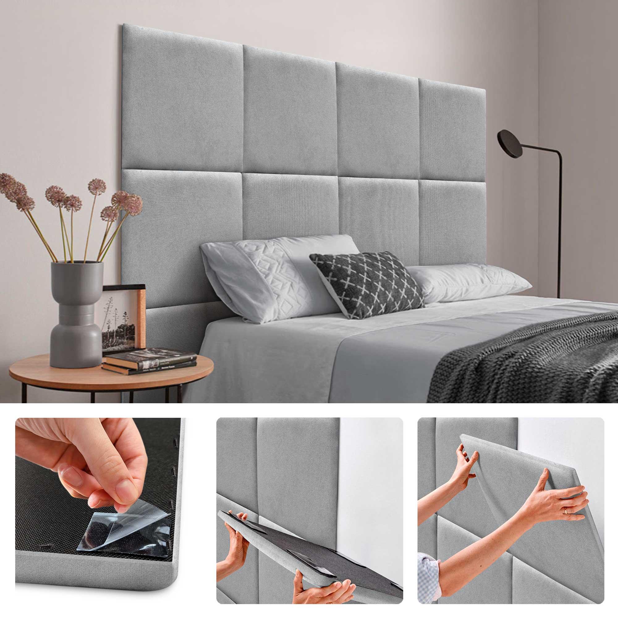 DHOME set van 8 zelfklevende gestoffeerde panelen voor muur, geluidsabsorberend, schokbescherming, hoofdbord (Grijs, 60x60cm, x8)