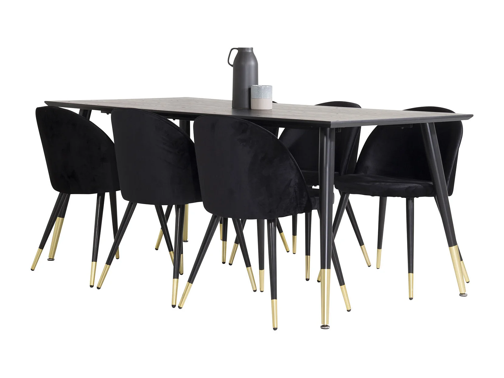 Dipp180x90BLBR eethoek eetkamertafel zwart en 6 Velvet eetkamerstal PU kunstleer zwart.