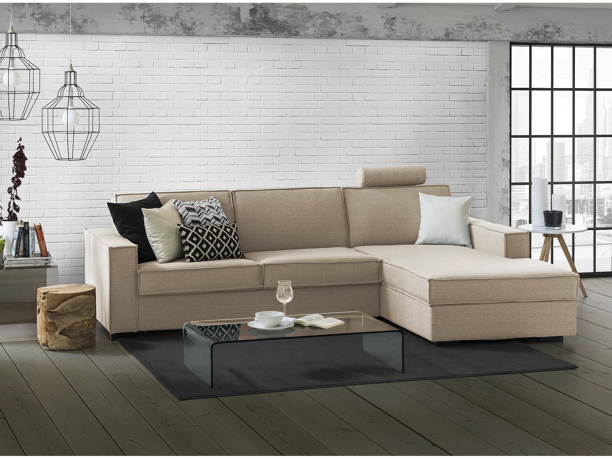 Dkiyin vaste bank, Hoekbank, 100% Made in Italy, Woonkamerbank met containerschiereiland rechts, met standaard armleuningen, 280x95h90 cm, Beige
