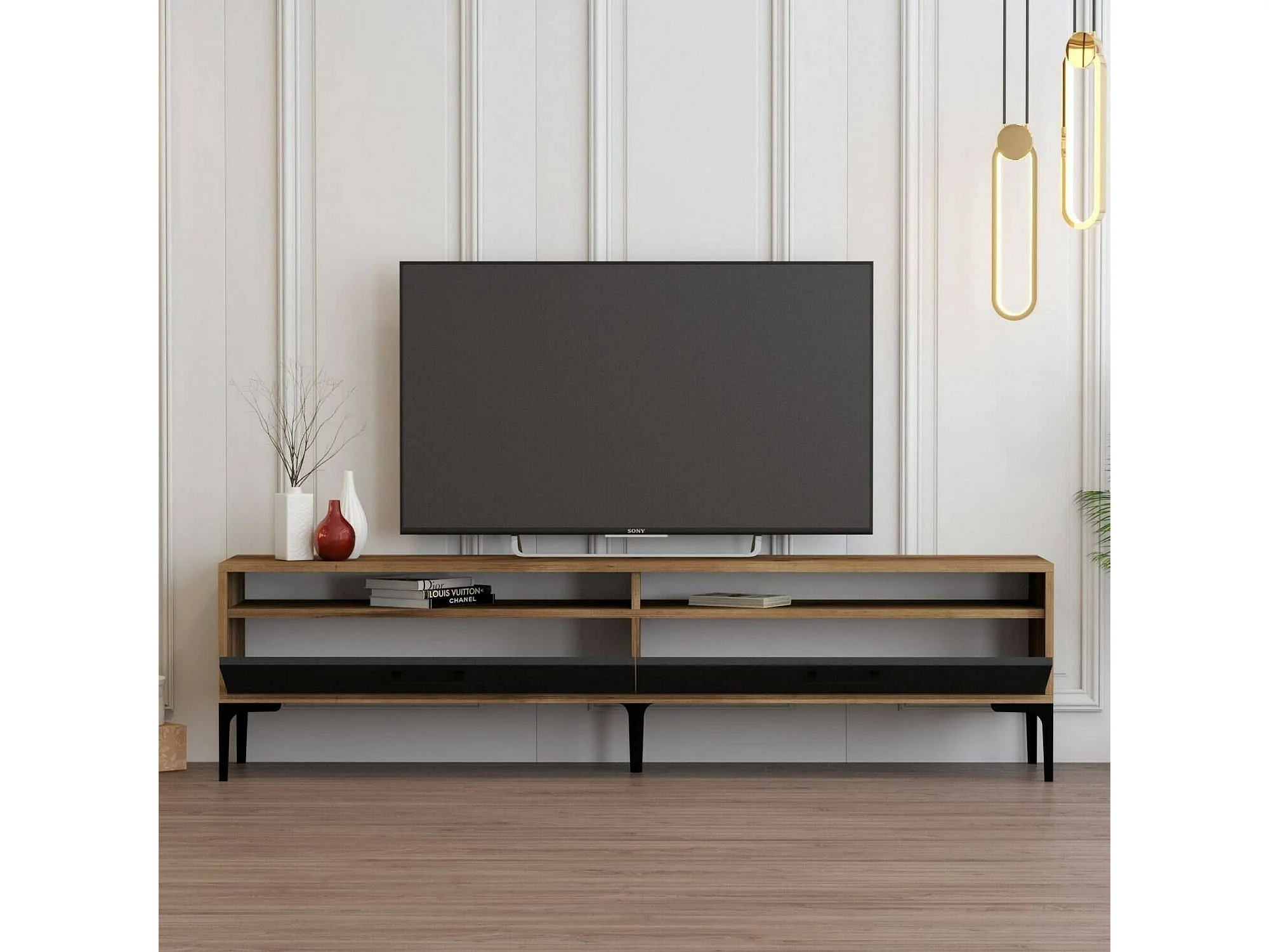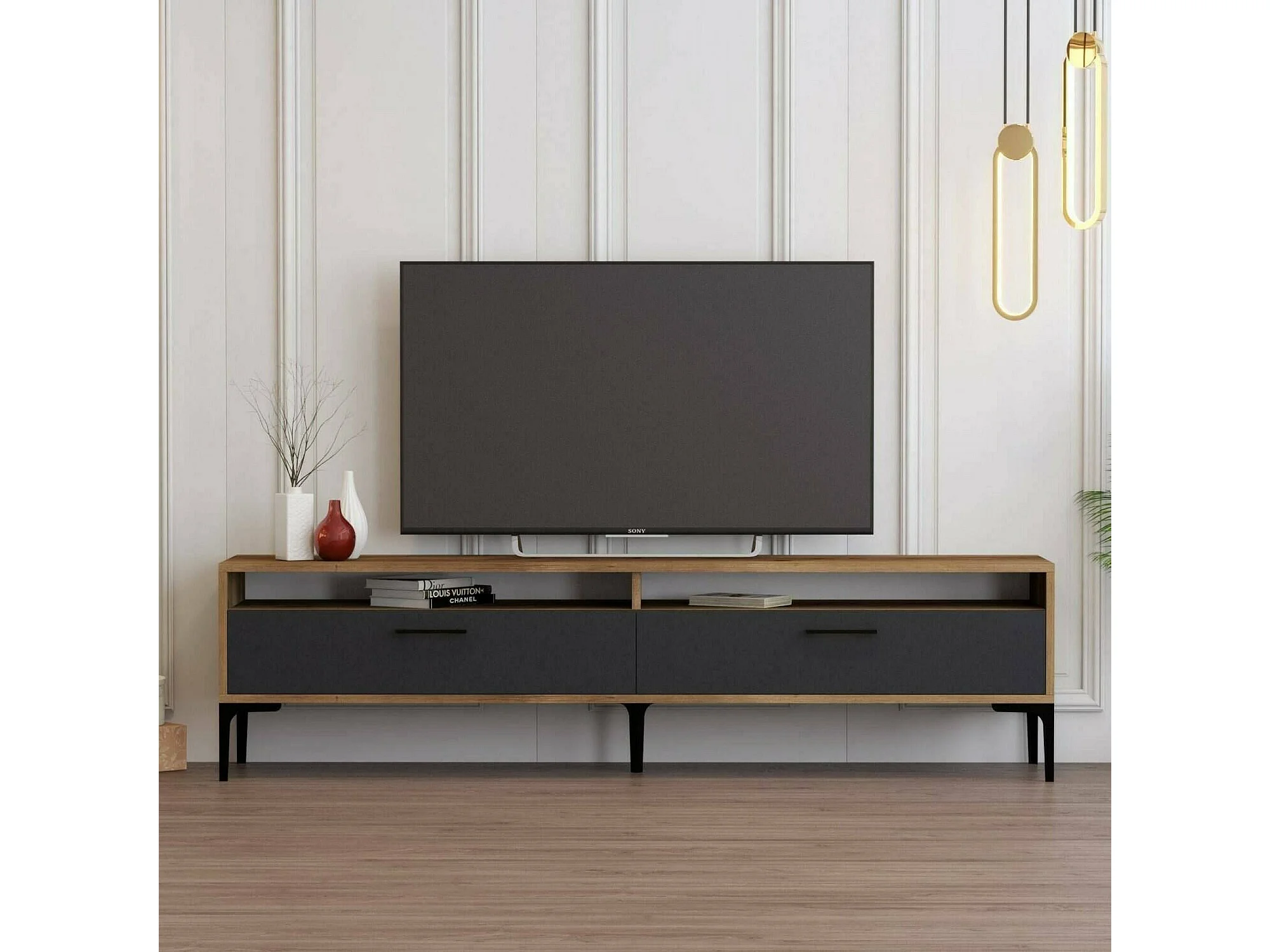 Dkumbull tv-meubel, woonkamermeubel, lage tv-meubel, wandstandaard, 180x47h35 cm, walnoot en antraciet