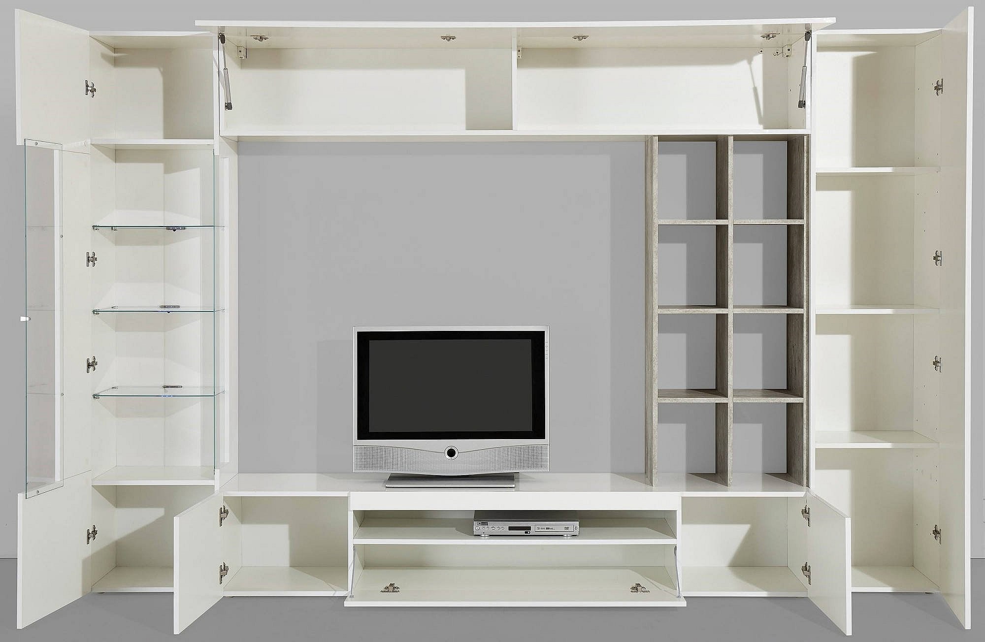 Dmuldu wandsysteem, Woonkamerset, Multifunctioneel woonkamermeubilair, Modern wandsysteem, 200x41h50 cm, Cement en Glanzend Wit