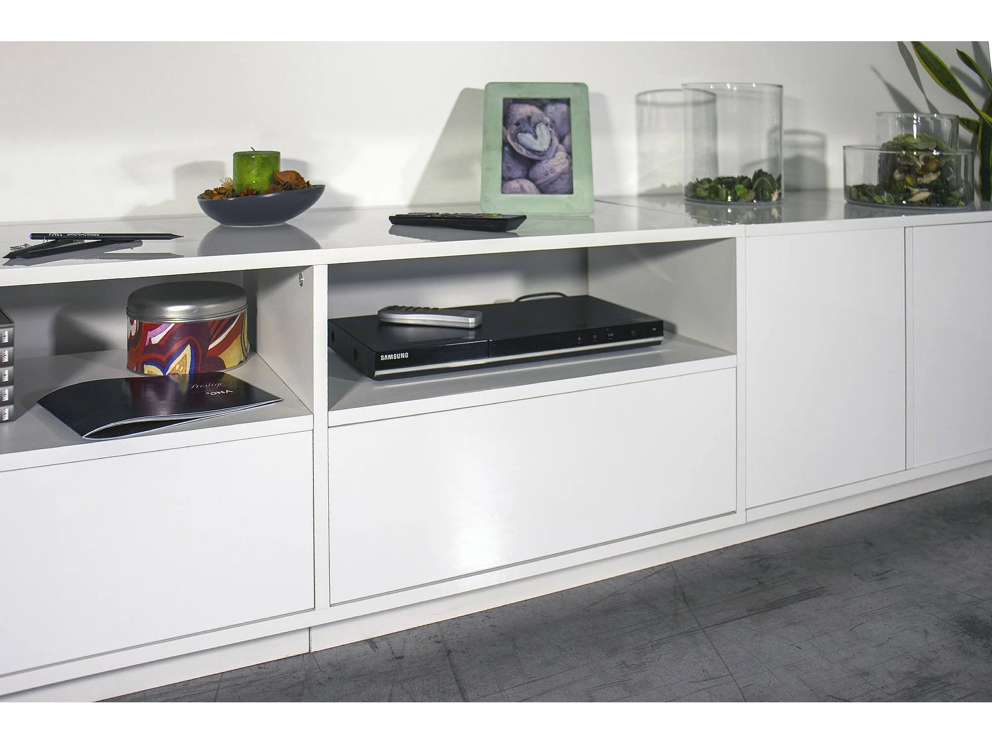 Dleott TV-meubel, Laag woonkamerdressoir, TV-meubelbasis, 100% Made in Italy, 260x41h46 cm, Glanzend wit