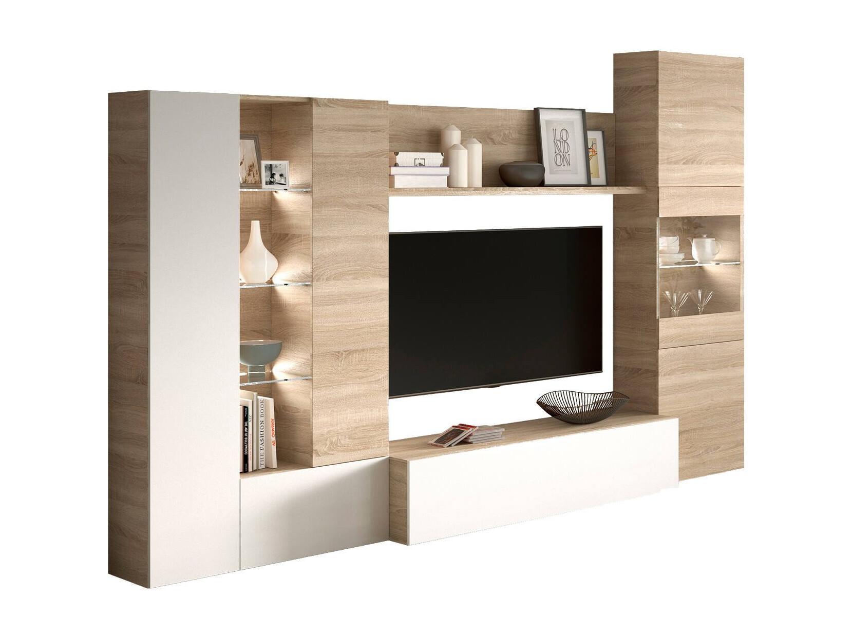 Dmaj wandsysteem, Modulair TV-meubel woonkamermeubel, Woonkamercompositie met bovenkasten en vitrines en LED-licht, 260x42h185 cm, Eiken en Wit