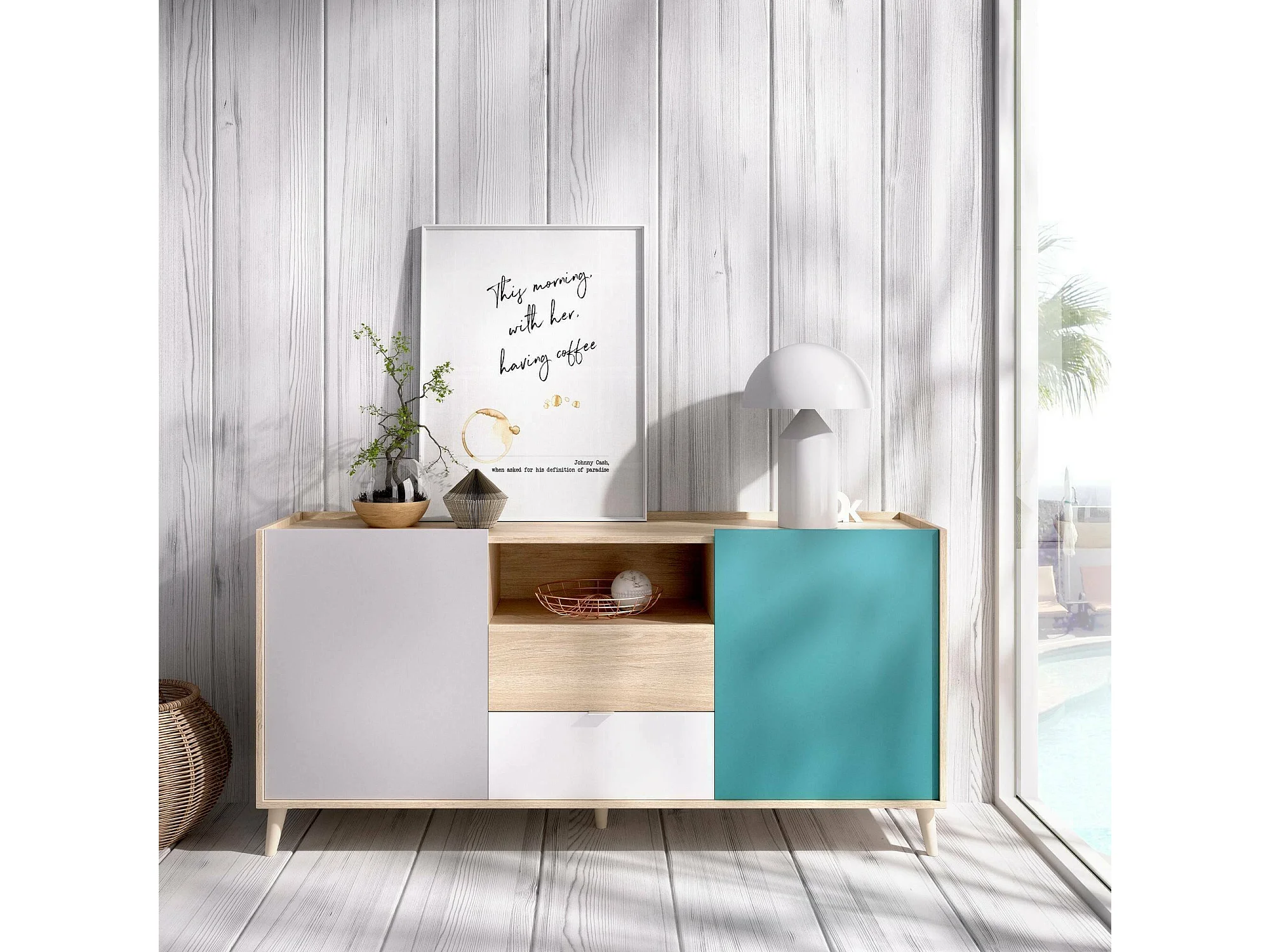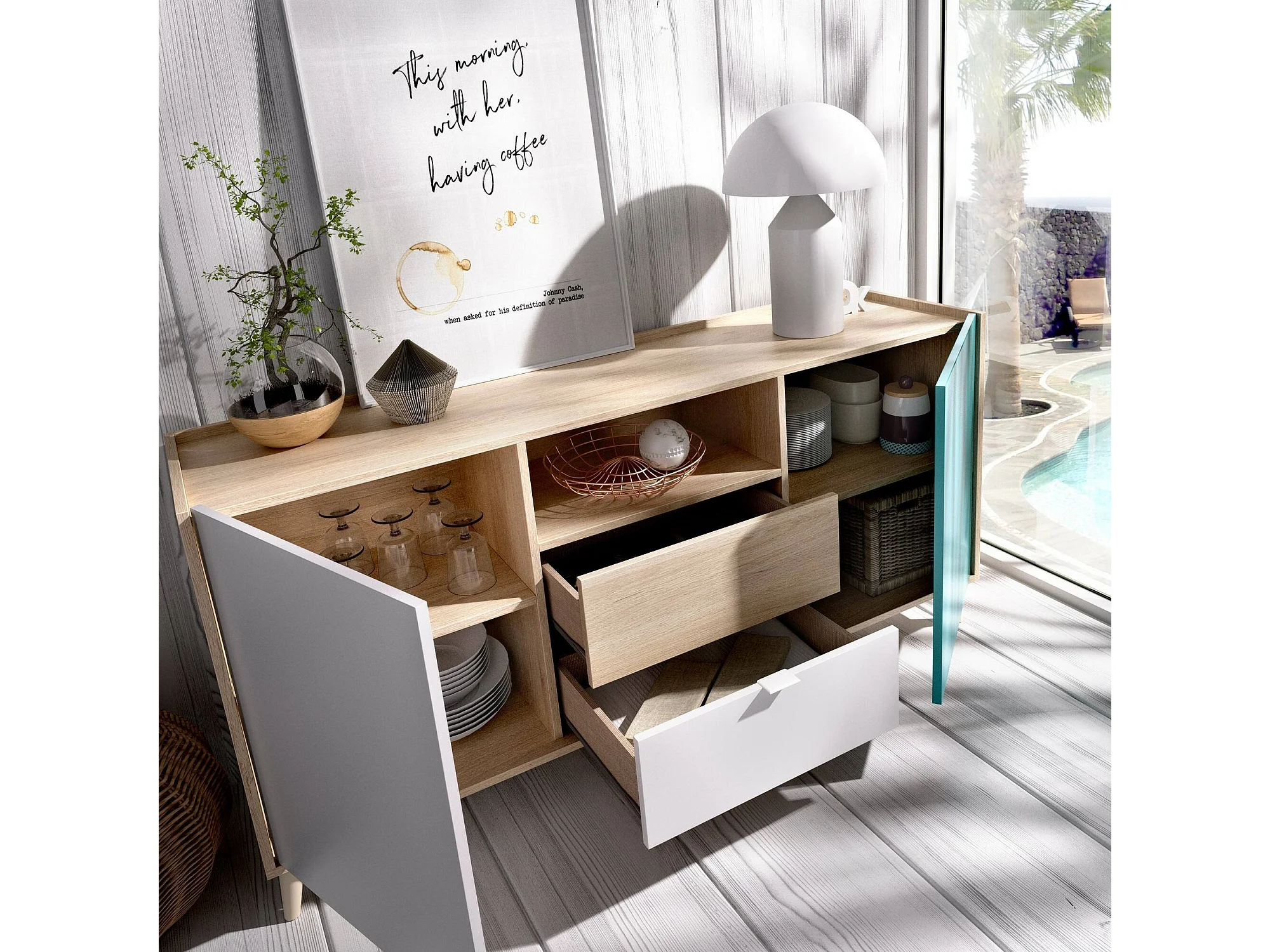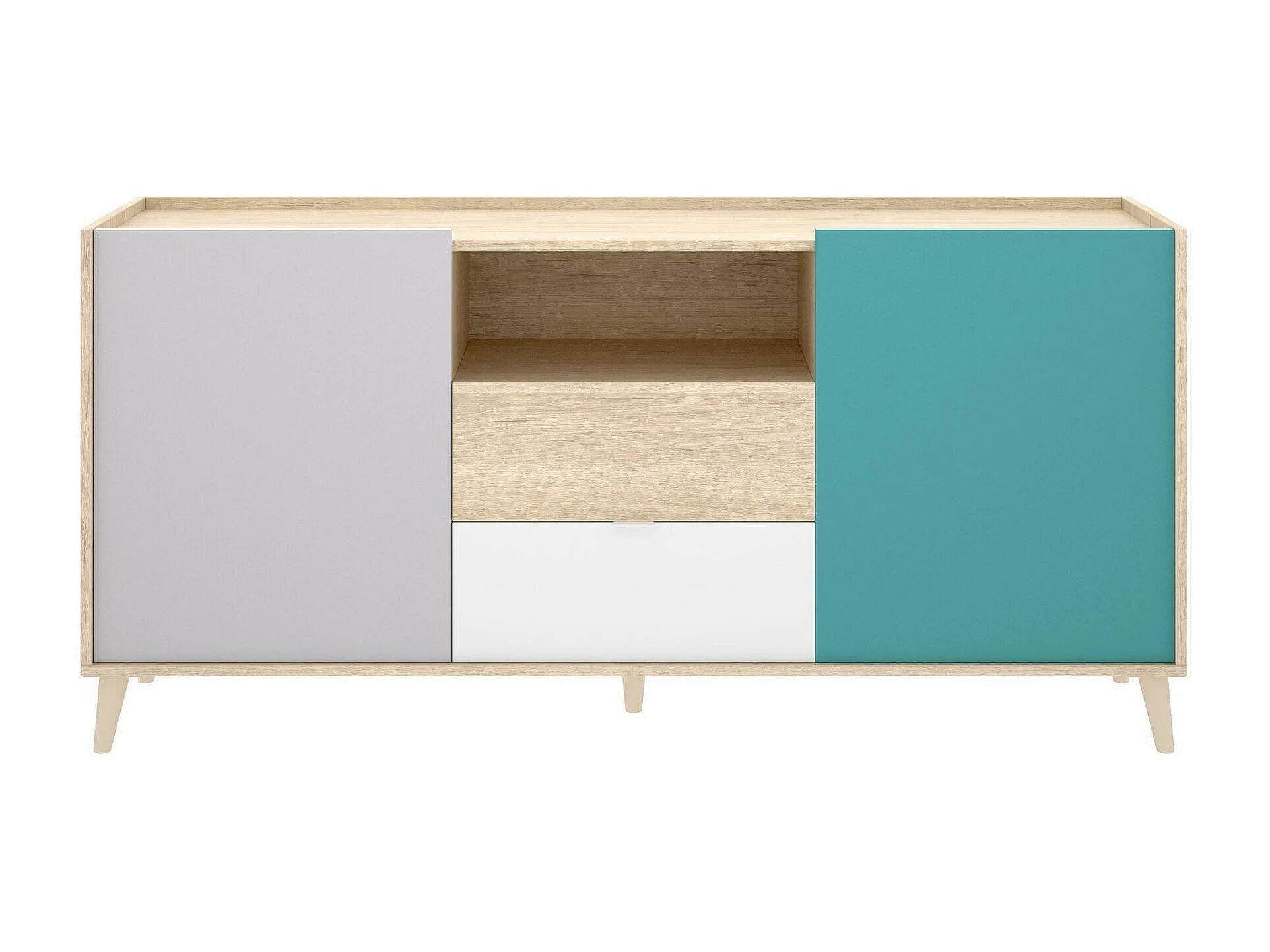 Dmaje dressoir, Woonkamerbuffet, Modern woonkamerdressoir met 2 deuren, 155x43h75 cm, Wit en Eiken