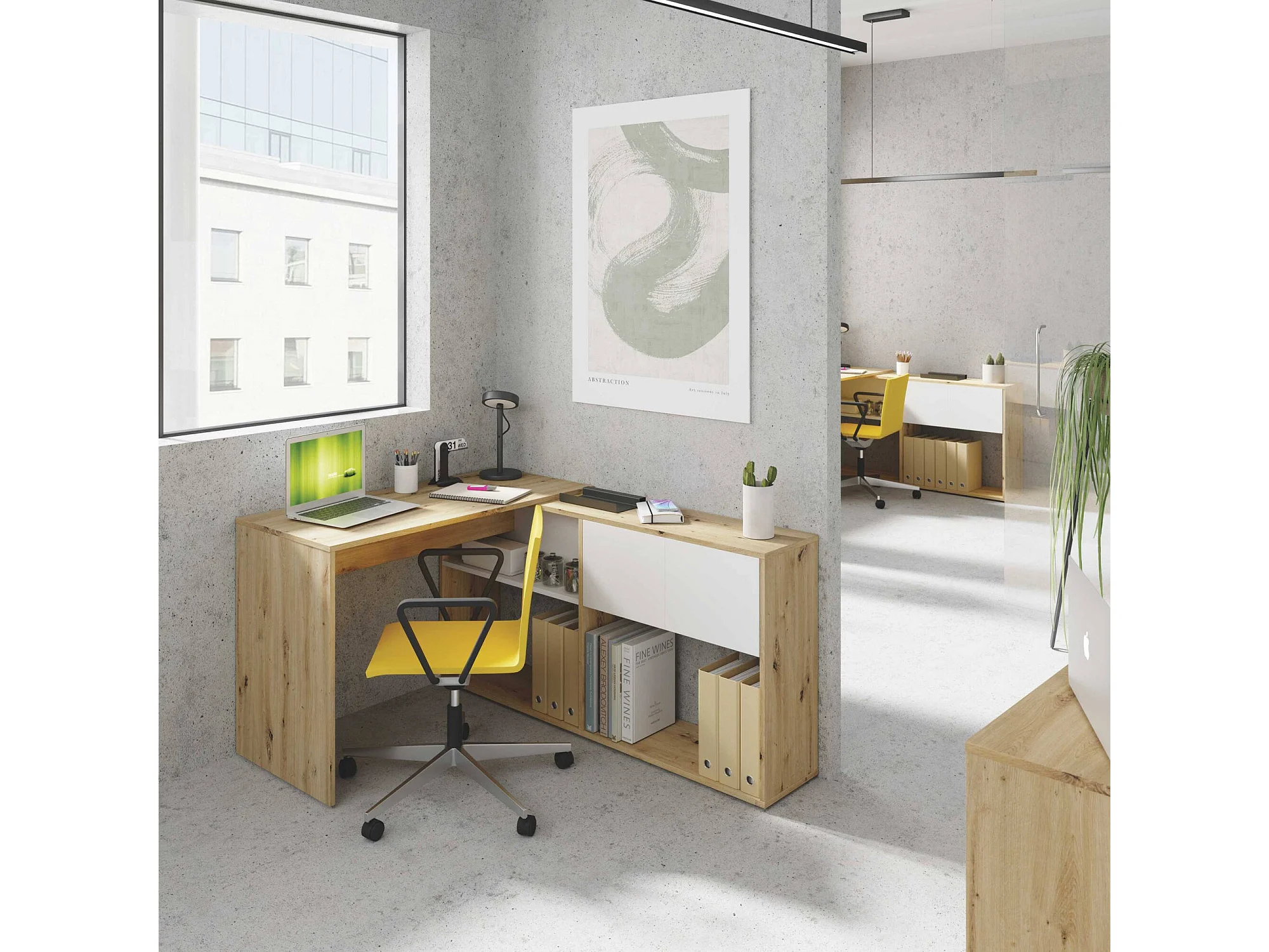 Dmangn Bureau, Multifunctioneel omkeerbaar hoekbureau met boekenkast, Multi-positie studeer- of kantoortafel, 108x70h140 cm, Wit en geknoopt eiken