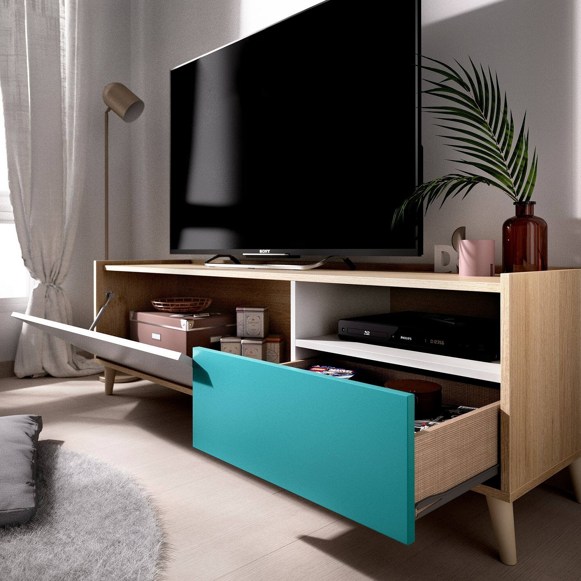 TECHNISCHE EIGENSCHAPPEN - Volledig gebouwd uit gemelamineerde spaanplaatpanelen, bestand tegen stoten en krassen, en duurzaam in de loop van de tijd - Artikel meegeleverd ABS poten met eikenkleurige afwerking en gaskompas voor de horizontale klepdeur - Maximaal aanbevolen tv-formaat: 65" - Product voorzien van metalen schuifgeleiders voor de laden met textielafwerking aan de binnenkant - Maximaal ondersteund gewicht tv-meubel: 50 kg - Omkeerbare montage: it is mogelijk om de spouw aan beide zijden te installeren - Classificatie op basis van inhoud of vrijgave van formaldehyde TYPE E1 - Snelle en eenvoudige reiniging dankzij het materiaal waaruit het is gemaakt - Gedemonteerd geleverd met kit en montage-instructieboekje - Bijzondere zorg en aandacht voor de verpakking , dat resistent en geschikt is voor transport - De montage van het meubel is omkeerbaar.