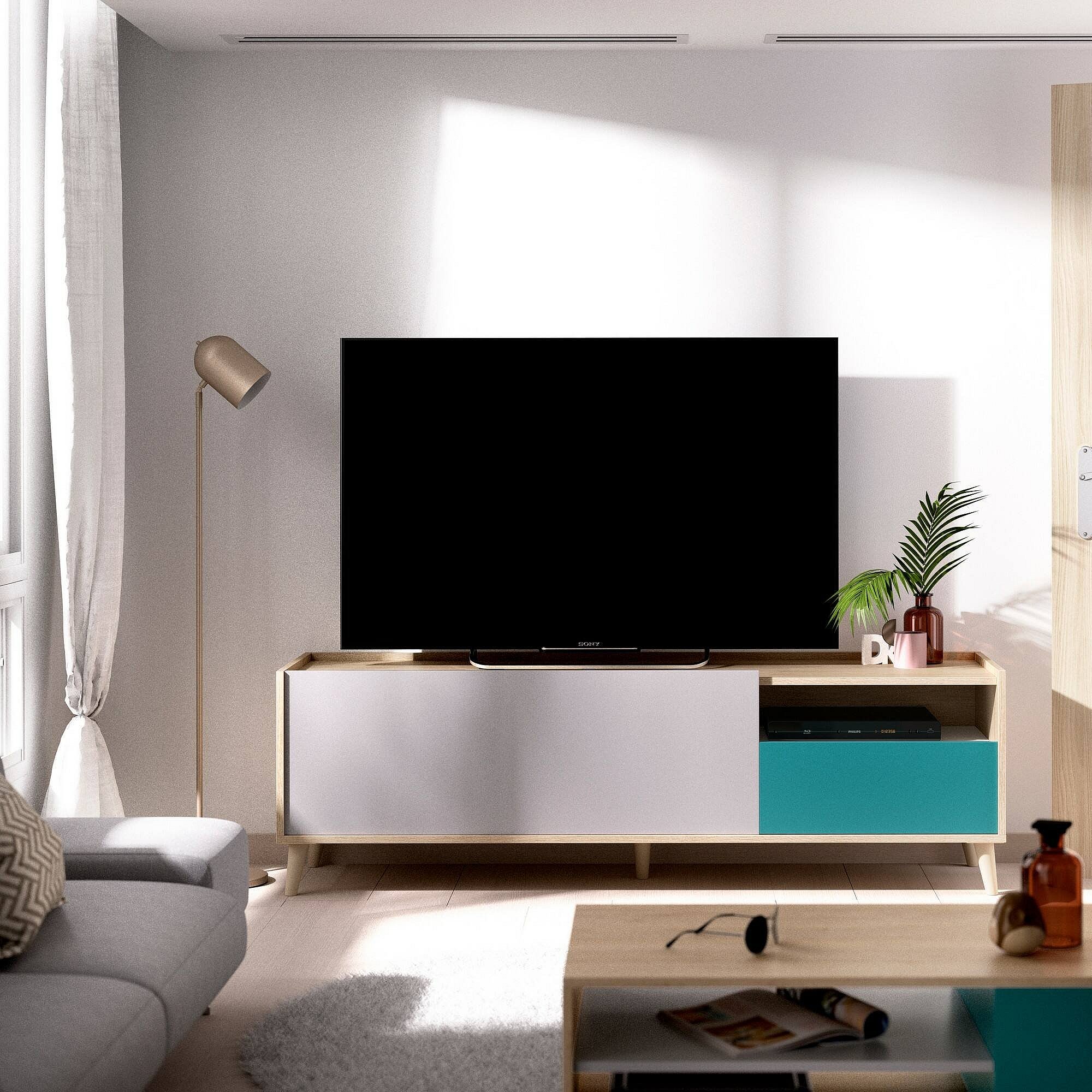 STRUCTUUR EN GEBRUIK - Modern televisiemeubel, gestructureerd met een klepdeur, een open vak en een lade - De keuze van de interne structuur waaruit deze woonkamercompositie bestaat, maakt het ontwerp van dit meubelstuk modern, functioneel en ruimtebesparend - De deuren hebben sterke en duurzame metalen scharnieren - De bovenste plank is perfect voor het plaatsen van uw tv of uw favoriete ornamenten - Met zijn eikenhout, grijze, witte en smaragdgroene kleuren, het is modern en innovatief, perfect voor inrichtingsomgevingen met ruimtevereisten.