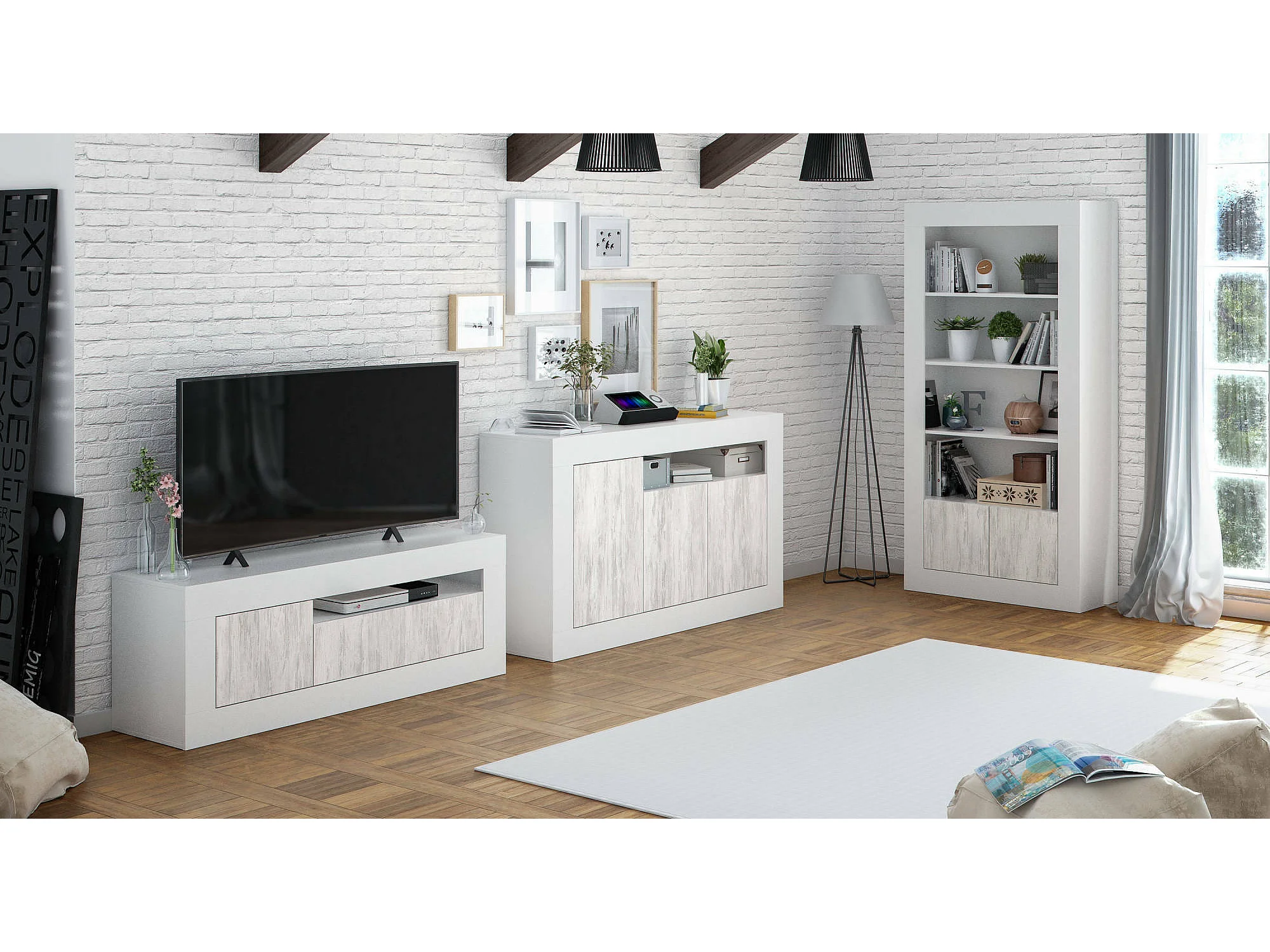 Dmirri dressoir, Modern dressoir met 3 deuren, Woonkamerbuffet met vakken, Woonkamerdressoir, TV-meubel, 144x42h87 cm, Wit