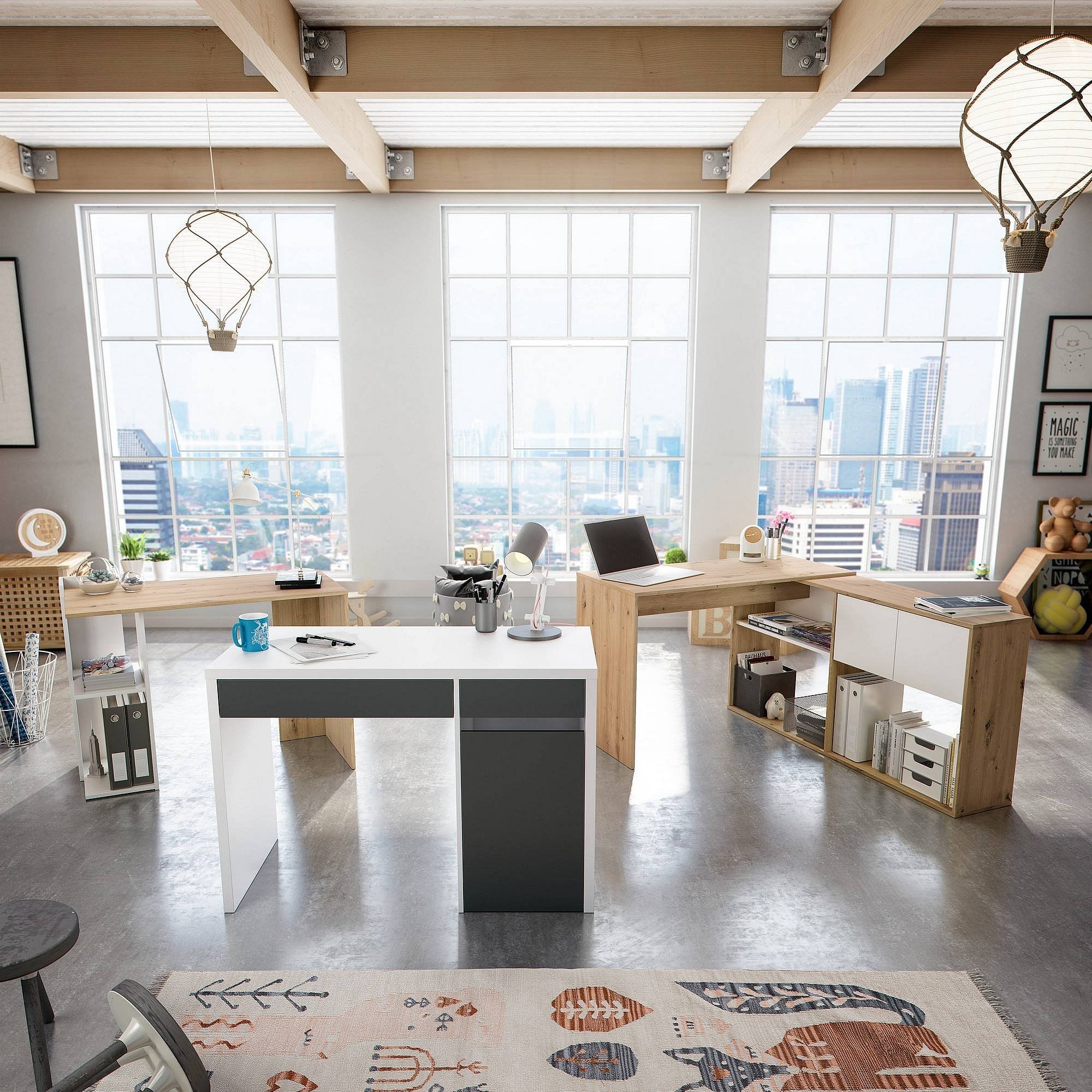 Dmonti Bureau, Multifunctioneel omkeerbaar bureau met meerdere posities, Studeer- of kantoortafel voor pc met plank en planken, 100x52h78 cm, Wit en geknoopt eiken