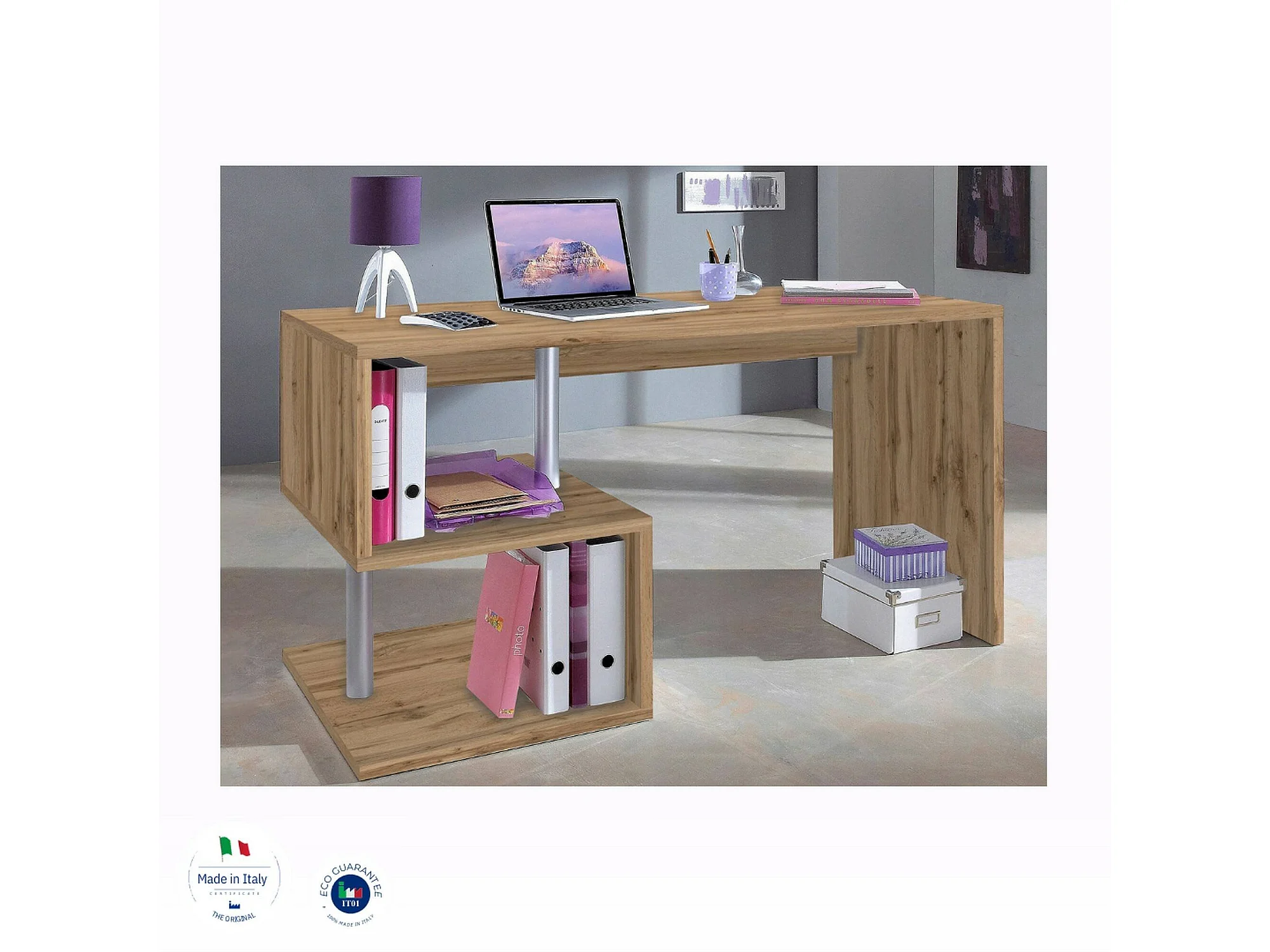Dmorisc bureau, Lineair pc-bureau, multifunctionele kantoortafel, ruimtebesparend bureau met meerdere posities, 100% gemaakt in Italië, 140x60h78 cm, eiken