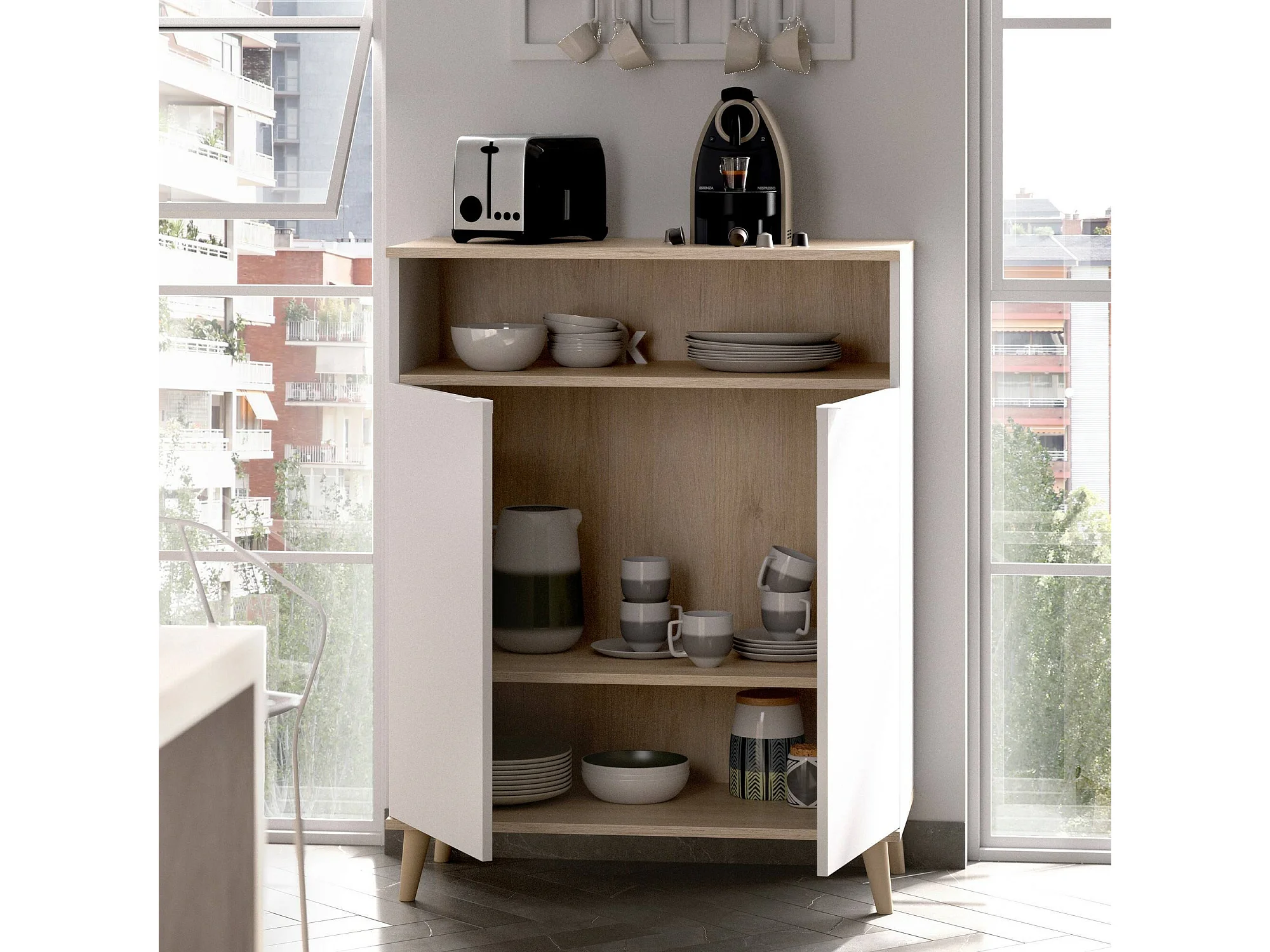 Dmossin dressoir, Woonkamerkastbuffet, Modern woonkamerdressoir met 2 deuren, 80x40h102 cm, Wit en Eiken