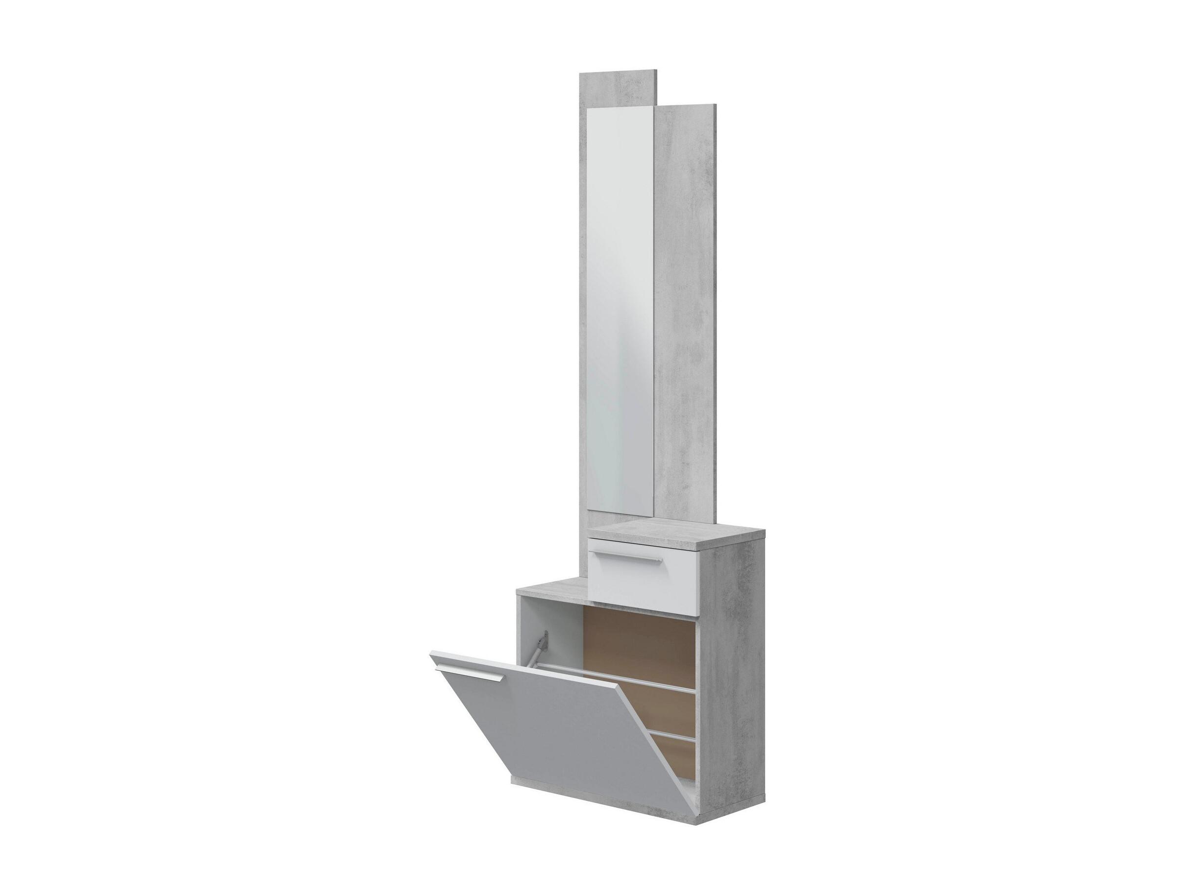 Waltham entreemeubel, multifunctioneel schoenenrek met spiegel, kledingkast met 1 deur en 1 lade, 61x28h185 cm, cement en glanzend wit