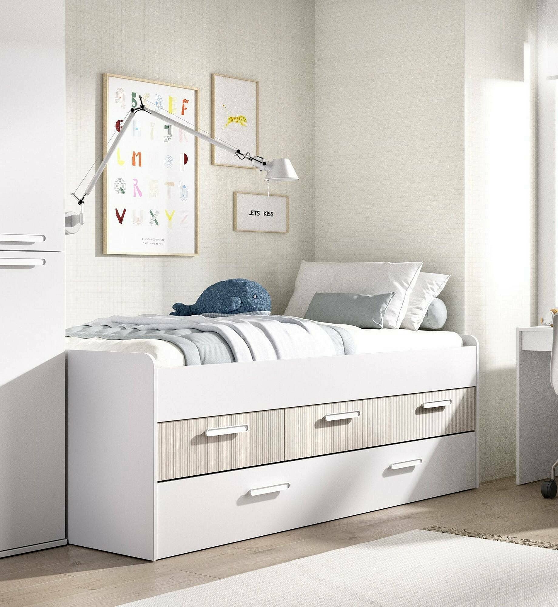 Dnore kinderbed, Kinderbedje voor kinderkamer, Slaapkamerset, Matrashouderstructuur, 194x95 h68 cm, Wit en Eiken
